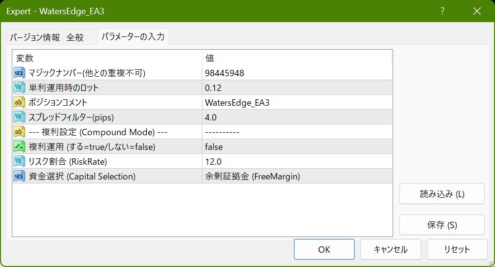 --- 複利項目の説明 --- ・複利運用 / Compound Mode 複利運用を行う場合は 'true'、行わない場合は 'false' を選択してください。 ・リスク割合 / RiskRate 資金残高に基づいてポジションのロット数を決定します。 (例) 5とした場合、0.01Lots / 10万円 10とした場合、0.01Lots / 10万円 50とした場合、0.05Lots / 10万円 ※資金残高により0.01ロット未満になる場合は0.01ロットでのエントリーになります。