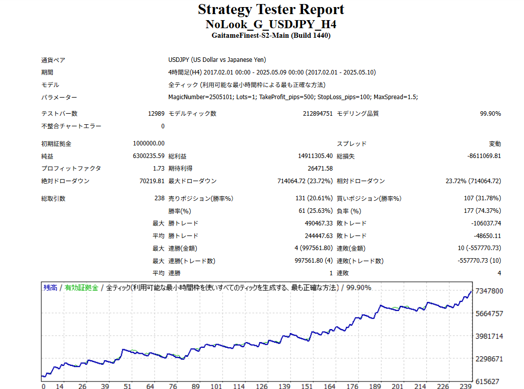 Increasing the lot size forcibly due to a high winning rate can, in rare instances, depending on the EA, lead to substantial Pips loss when a loss occurs. It is crucial to verify the SL Pips and the number of positions held before operating with an appropriate lot.