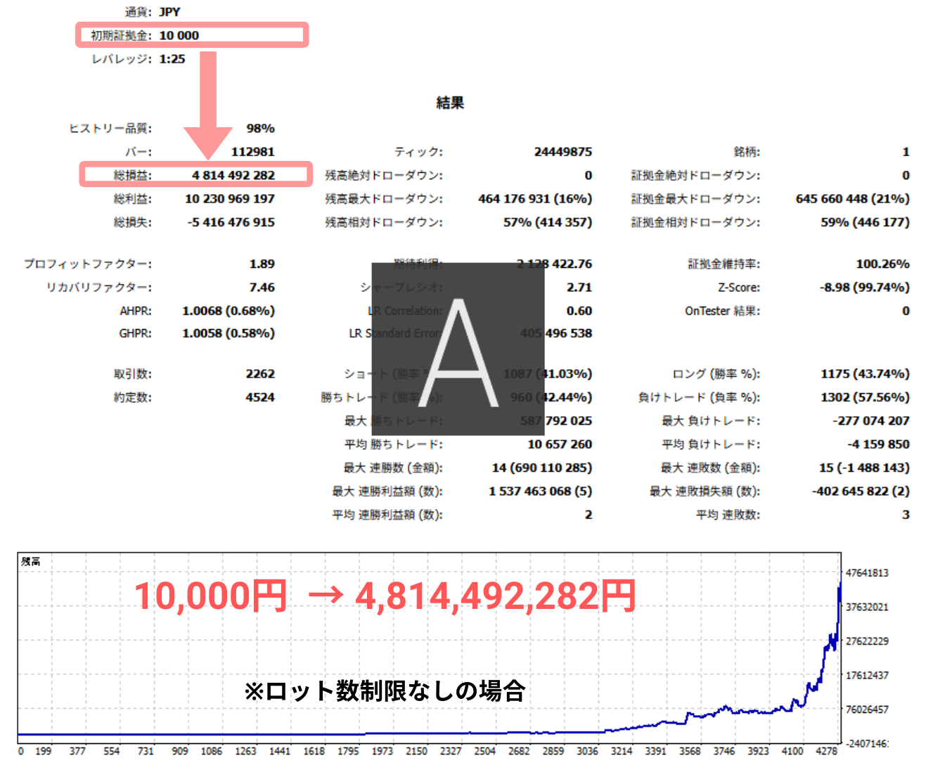 勝率自体は高くありませんが、1回のトレードあたりの損失を最小限に抑えるリスク管理と、複利機能(自動ロットサイズ調整)による長期運用を前提とした資金成長戦略により、少額の資金からでも大きな利益を狙うことが可能です。