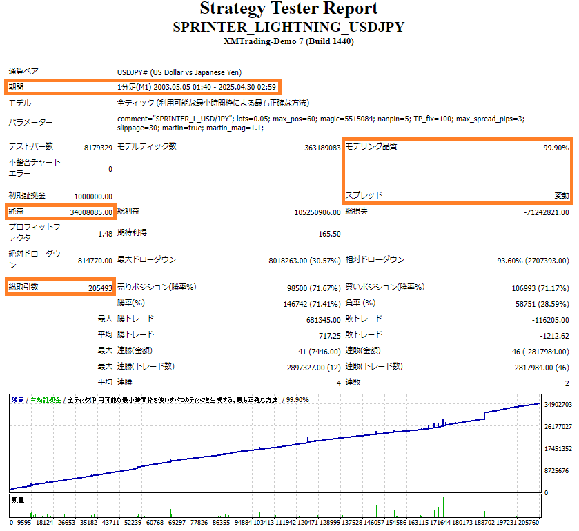 過去22年間の取引回数は205493回にのぼり、十分なサンプル数を確保しています。これにより、統計的に信頼性の高いデータを取得し、一時的な幸運ではなく、長期的な安定収益を生み出すEAであることが証明されています。