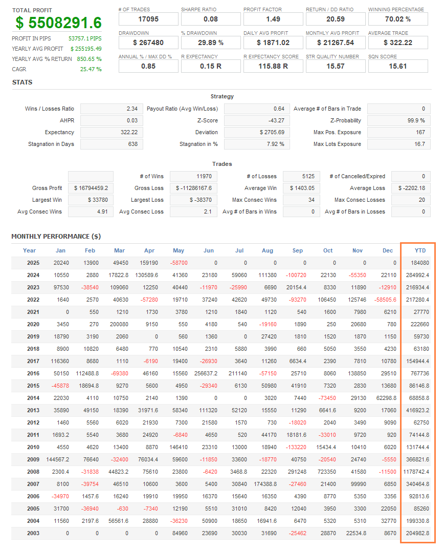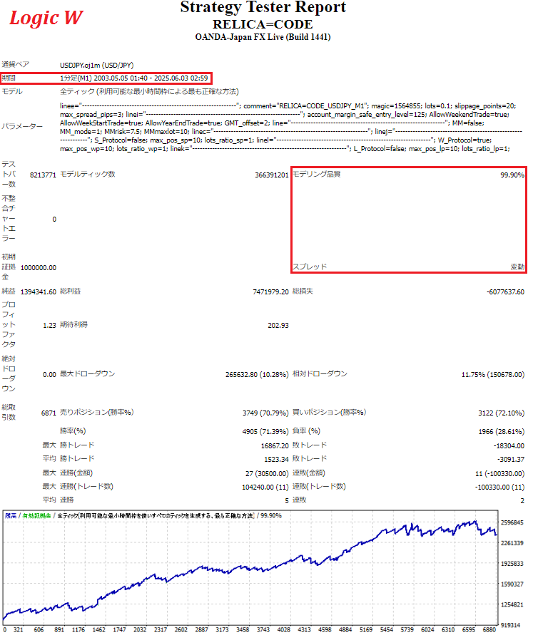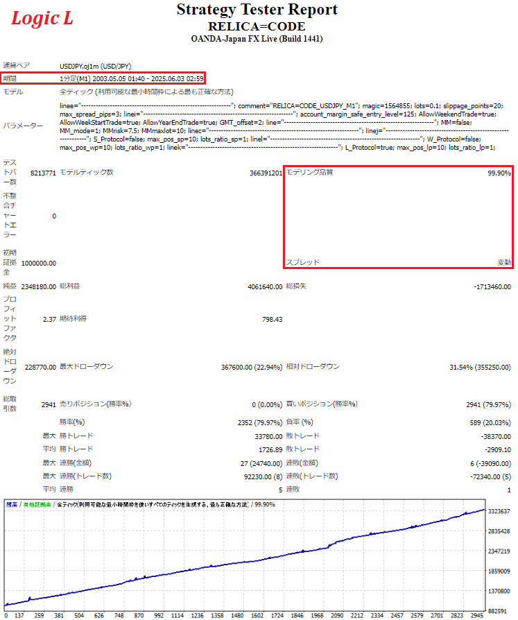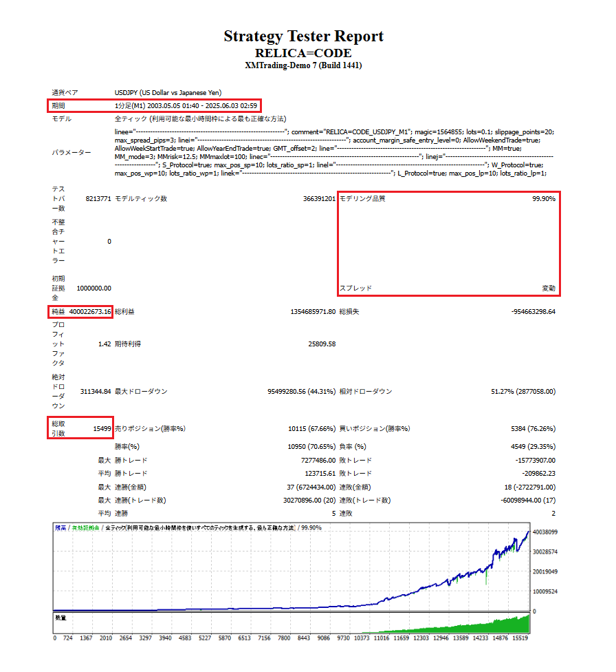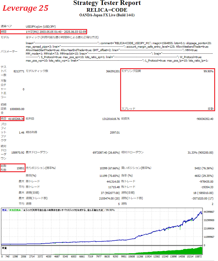 本EAは、2003年~2025年までの長期にわたるマーケットデータを走らせたバックテスト結果を公開。