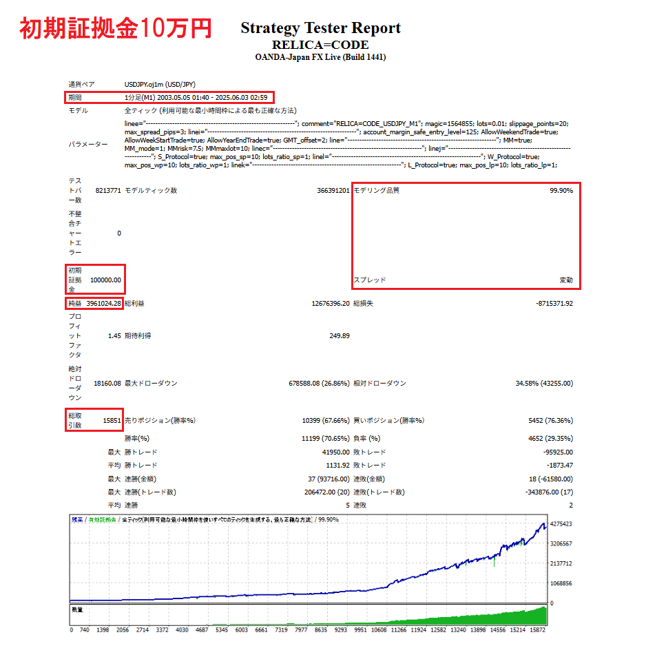 このように、RELICA=CODE_USDJPY_M1 は FXで負け続ける“平均的な参加者”から脱し、 安心して預けられる、使い続けられる、着実に利益になるEA を実現しています。資金管理を最重視し、トレードの土台から堅めた、まさに理想の自動売買ツールです。