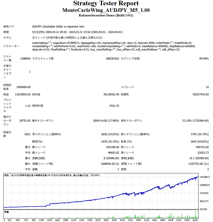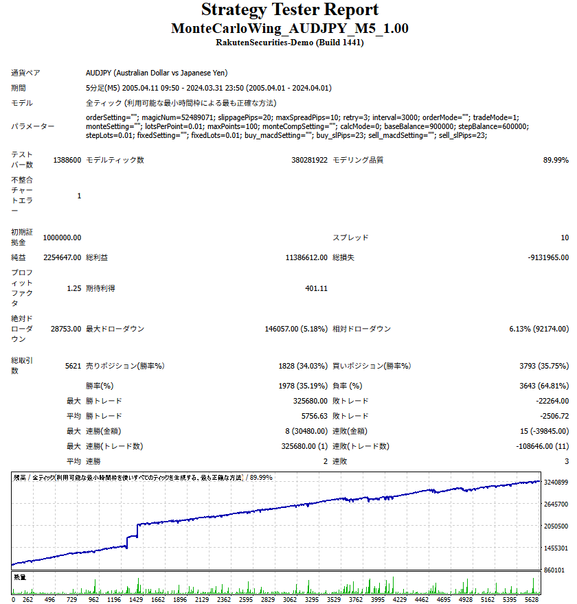 本EAは勝率:35.19%(バックテスト:約19年、トレード回数:5621で算出)で運用可能なロジックを採用しているため、