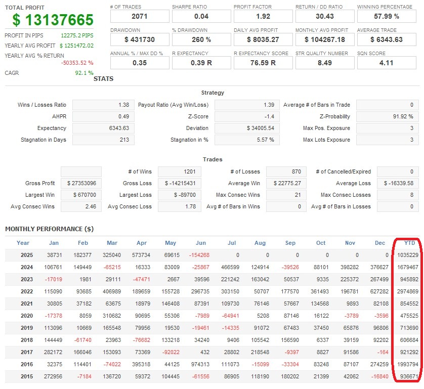 ขึ้นอยู่กับประเภทการซื้อขายของ EA มีช่วงเวลาที่เหมาะสมกับการซื้อขายตามแนวโน้มมากกว่าและช่วงเวลาที่เหมาะกับการซื้อขายที่ขัดแย้งกันมากกว่า ทำให้ผลลัพธ์ที่สม่ำเสมอในทุกช่วงเวลาไม่น่าเป็นไปได้ แม้ว่าปีที่แล้วอาจมีผลลัพธ์ที่ดี แต่ผลการดำเนินงานในปีนี้อาจไม่มีแนวโน้มที่ดีนัก ซึ่งจำเป็นต้องใช้ดุลยพินิจในระดับหนึ่งในการพิจารณาว่าเป็นเวลาที่เหมาะสมในการดำเนินการหรือไม่