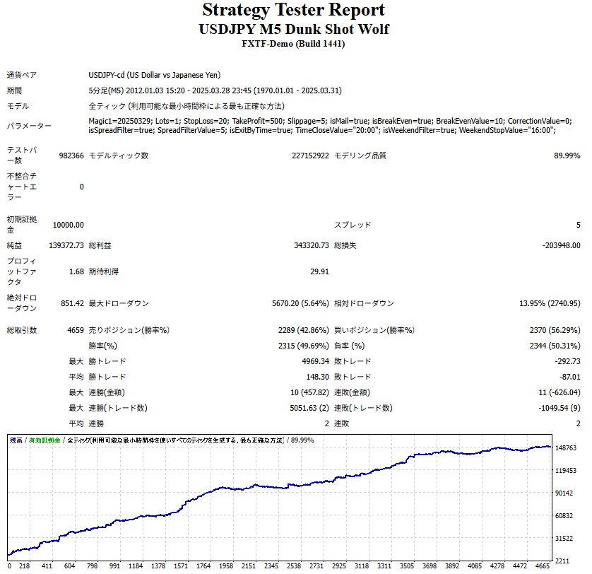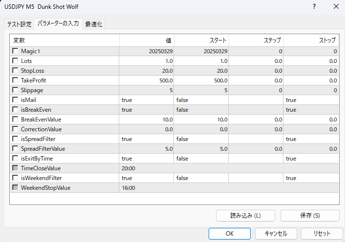 ✨ Magic1 説明:マジックナンバーを設定する項目です。 初期値:20250329 ✨ Lots 説明:ロット数を設定する項目です。 初期値:1 補足:証拠金に合わせて適宜調整してください。 ✨ StopLoss 説明:ストップロスの値を設定します。 初期値:20 補足:任意に変更可能です。 ✨ TakeProfit 説明:テイクプロフィットの値を設定します。 初期値:500 補足:主に内部ロジックで決済されるため、この数値に到達する前に決済されることがほとんどです。 ✨ Slippage 説明:許容スリッページの設定項目です。 初期値:5 ✉️ isMail 説明:エントリー時にメールで通知する機能です。 初期値:True(有効) 補足:MT4のオプションでメール送信設定が必要です。 ⚖️ isBrakeEven 説明:建値ストップ機能の有効/無効を選択します。 初期値:True(有効) ⚖️ BrakeEvenValue 説明:建値ストップを発動させるための含み益(Pips)を設定します。 初期値:10 ⚖️ CorrectionValue 説明:建値よりも有利な位置にストップロスを設定できます。 初期値:0 補足:例:2と設定すると、+2Pipsの位置にストップが移動します。 ⚖️ isSpreadFilter 説明:スプレッドフィルターの有効/無効を設定します。 初期値:True(有効) ⚖️ SpreadFilterValue 説明:この値以上のスプレッド時にはエントリーを制限します。 初期値:5 ⏰ isExitByTime 説明:指定時刻にポジションを決済する機能の有効/無効設定。 初期値:True(有効) ⏰ TimeCloseValue 説明:指定した時間(金曜20:00)にポジションを決済します。 初期値:金曜 20:00(MT4サーバー時間依存) 補足:例:FXTFの夏時間(GMT+3)では土曜日2:00に決済。