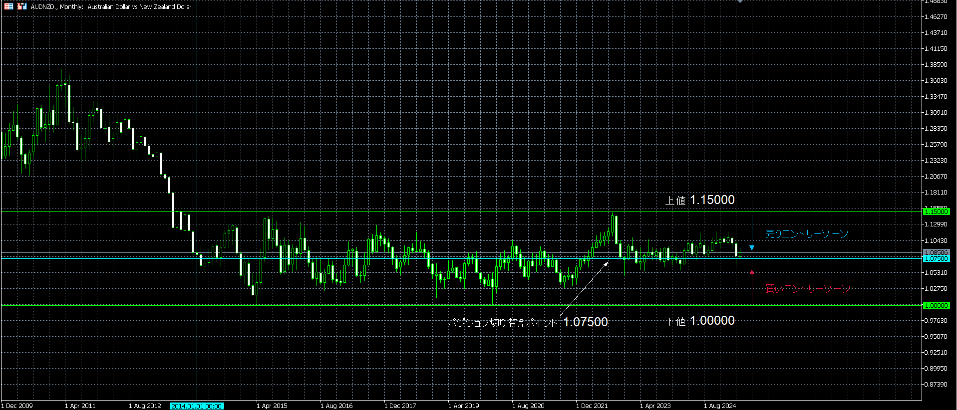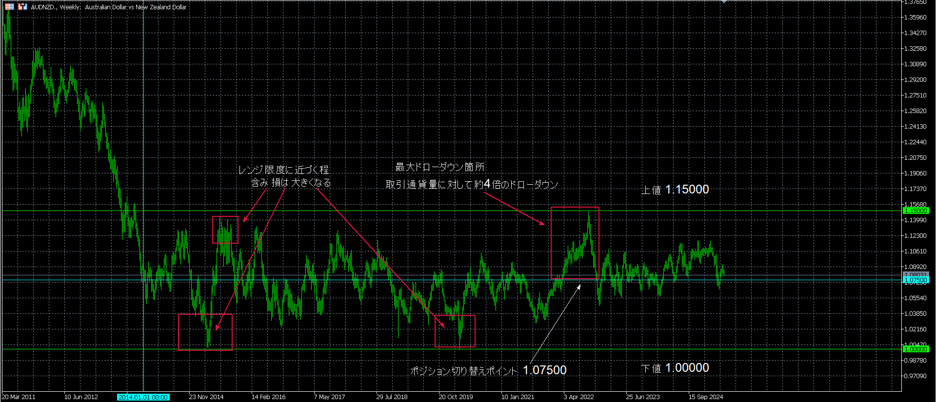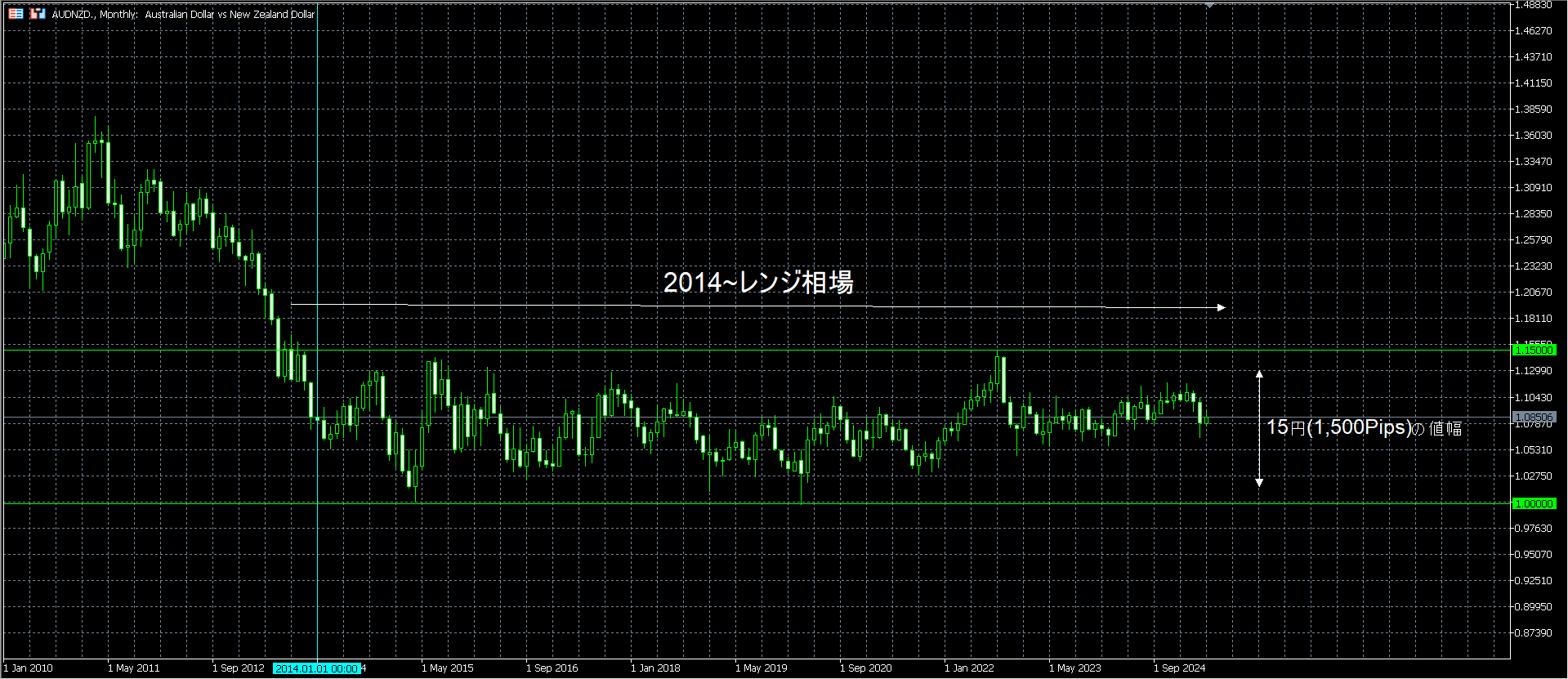 ・オーストラリアとニュージーランドの隣り合う二国間の通貨ペアで、経済的な結びつきが強い事から、2014 ~ 本日まで10年以上に渡り、約15円程度の値幅(レンジ)を推移しており、比較的安定した流動性の低い通貨ペアです。レンジ相場と相性の良いリピート型自動売買システムに向いている通貨ペアと言えます。