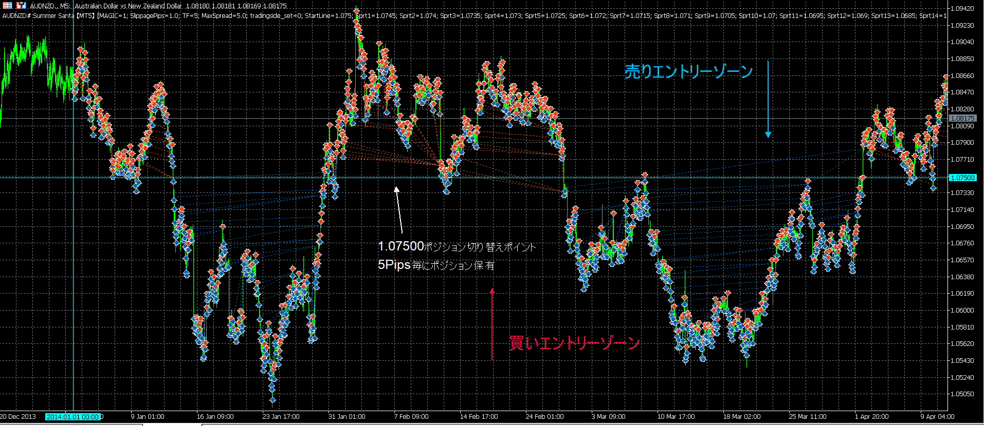 ・スプレッドがエントリー条件下にあり、EA稼働レンジ内で、5Pips毎に定められたエントリーポイントに価格が侵入してきた場合に、1.07500(ポジション切り替えポイント)より価格が上にあれば売りポジション、価格が下にあれば買いポジションを保有します。