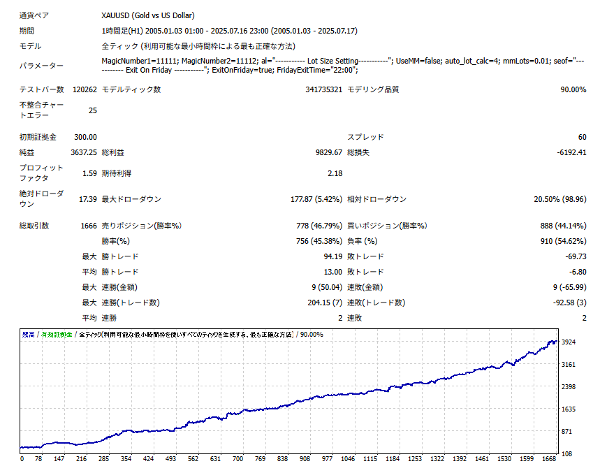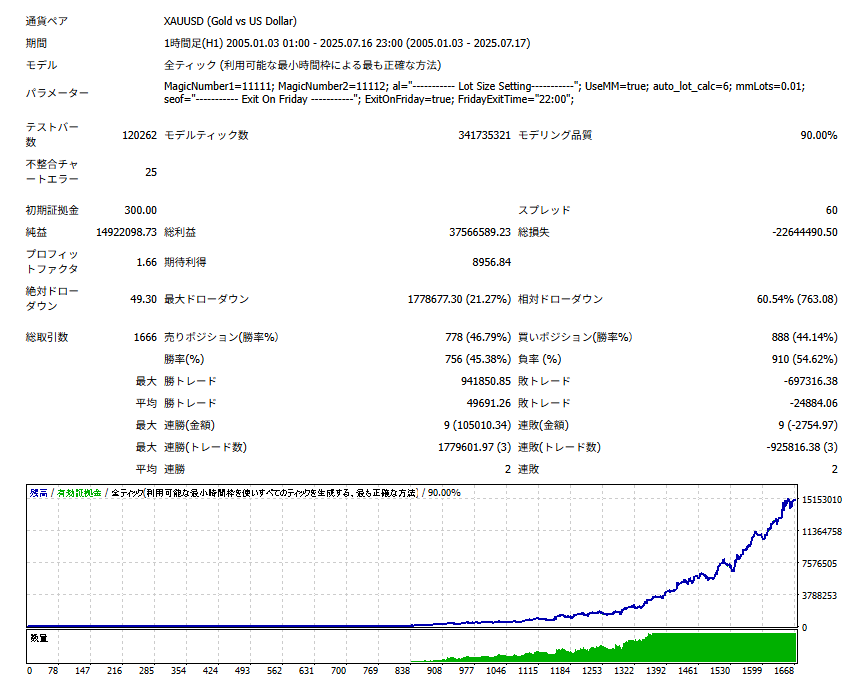 このEAは、XAUUSDの1時間足向けで、1トレードあたりのリスクを抑え、少額の資金から大きな利益を目指します。