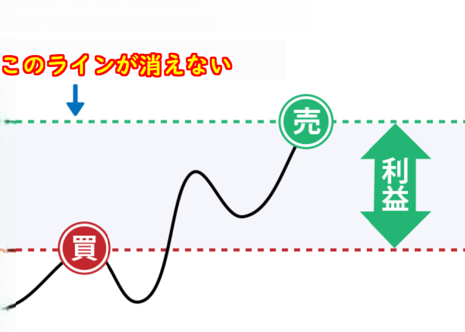 価格が下降中、買いでエントリーしたあとでも、価格が下がる場合があります。その場合、損切りせずにそのままポジションを保有します。価格が上がってくれたら利確して利益に成ります。もし、価格が下がり続けた場合は、含み損が膨らみます。