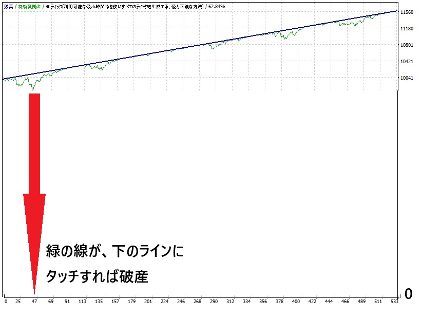 しかし、相場は一方的に上がり続けたり下がり続けることはせずに、波を形成しながら上昇、下降するものです。下降トレンドの中でも波があって、そのなかで利確します。AutoPilotはトレンド相場では含み損は膨らみますが、同時に資金も増えます。資金が増えれば破産確率は減ります。資産量を増やして、安全圏まで行ってしまえば破産する心配はゼロに近くなるはずです。このような取引手法をポジショントレードと言います。
