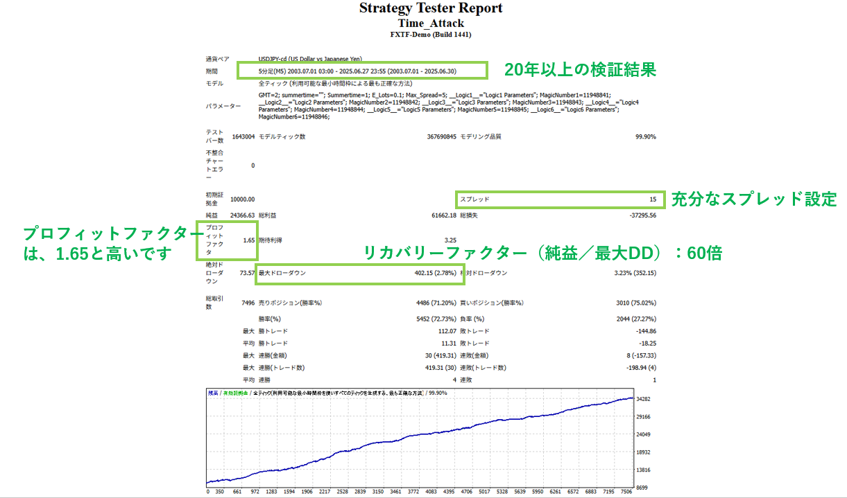【特徴】 当EAは複数のロジックで安定した資産運用を実現したUSDJPYのEAです。 ゴトー日のアノマリーと押し目を狙うEAを複合し、安定な資産積み上げを目指します。 <EA提供基準> ①長期間(10年以上)のバックテストで右肩上がりであること ②最大ドローダウンに対して、利益が充分であること ③3ヶ月以上のフォワード運用で運用実績を積んだものであること ■□■□【 パラメータ設定】 □■□■ ◆USDJPY・5分足にセットしてください ◆マジックナンバー/初期値:73198511 - 73198516 EAごとに割り当てられる番号。 ※複数のEAを稼働する場合は、必ずEAごとにそれぞれ違う番号を割り当ててください。 ※他のEAと重複していなければ変更する必要はありません。 ◆ロット/初期値:0.1 推奨ロット:資金100万円→0.2、50万円→0.1、10万円→0.02 (0.1lot=10,000通貨、許容できるリスクを資金の20%以内とした場合) ※証券会社・口座タイプにより、0.1lot=10,000通貨でない場合もございますのでご注意ください。 ※ロット決定の目安→バックテストの最大ドローダウン×2=資金の20%以内 ご自身の資金や許容リスクに合わせて設定してください。 ◆GMT/初期値:2(冬時間を入力) ◆サマータイム/初期値:米国式(プルダウン選択) ※GMTとサマータイムはご利用の証券会社が採用している時間帯を選択してください。