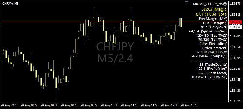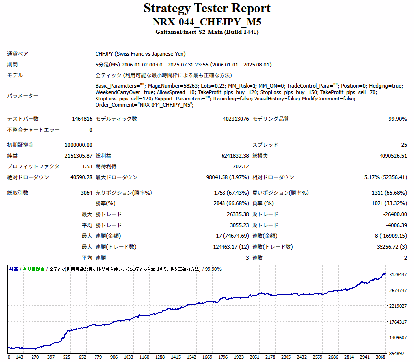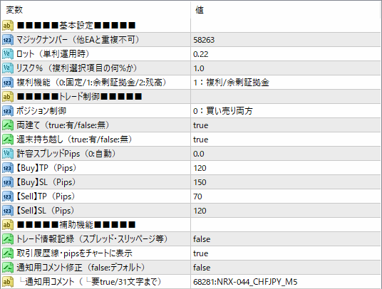 NRX-044は、地政学リスクが低いとされるスイスフランと、日本円といった、信用力の高い通貨同士の組み合わせで短期売買を狙う、防御力を意識したスキャルピングタイプの自動売買EAです。