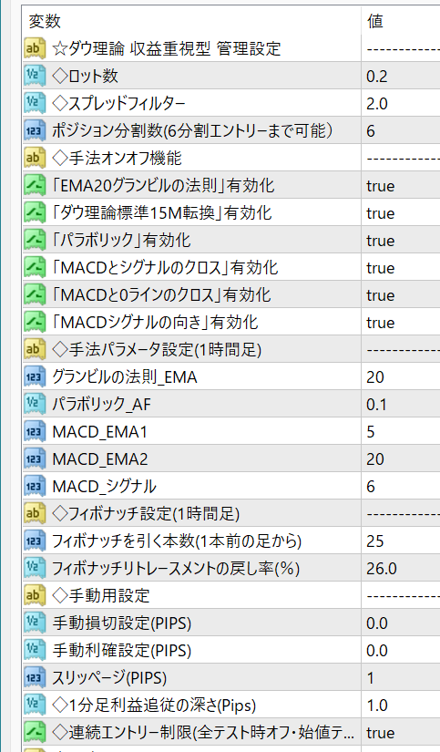 このEAのパラボリックはダウ理論と組み合わせつつ、様々な角度から勝つべくして勝つ状況のみに使用することで、パラボリックの有効性を高めます。