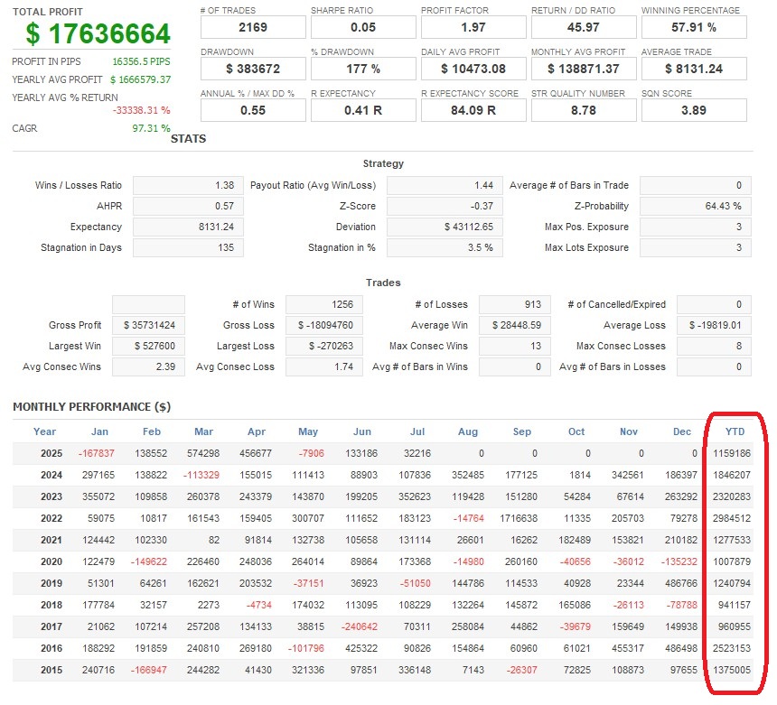 There is an absence of self-serving rule modifications, a common human tendency, such as increasing the lot size after consecutive losses in discretionary trading or, conversely, hastily securing profits with minimal gains.