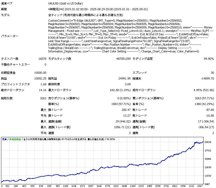 「R-Edge XAUUSD」は、上昇相場で大きく利益を得ることを目的としたのゴールド買い10ロジック損小利大タイプのデイトレスイングEAです。