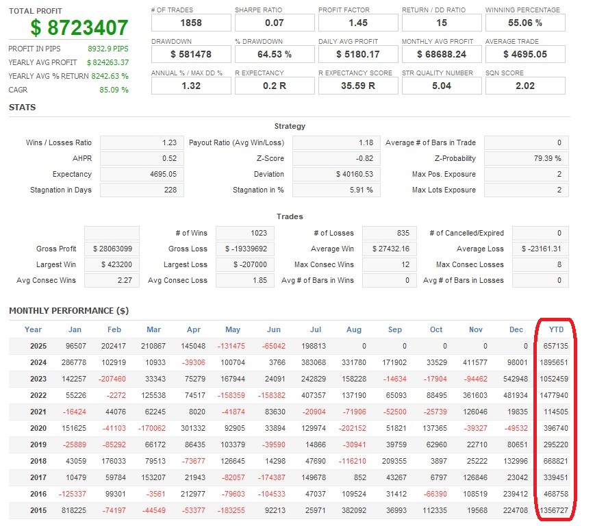 There is an absence of self-serving rule modifications, a common human tendency, such as increasing the lot size after consecutive losses in discretionary trading or, conversely, hastily securing profits with minimal gains.