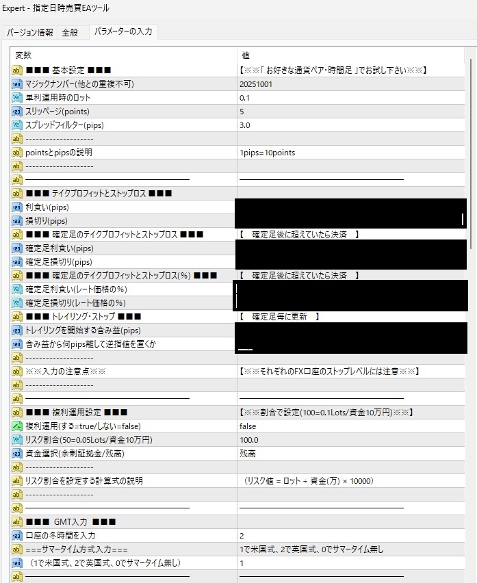 ・SL (Stop Loss): The set maximum loss pips (or specified amount, etc.) in the EA's settings