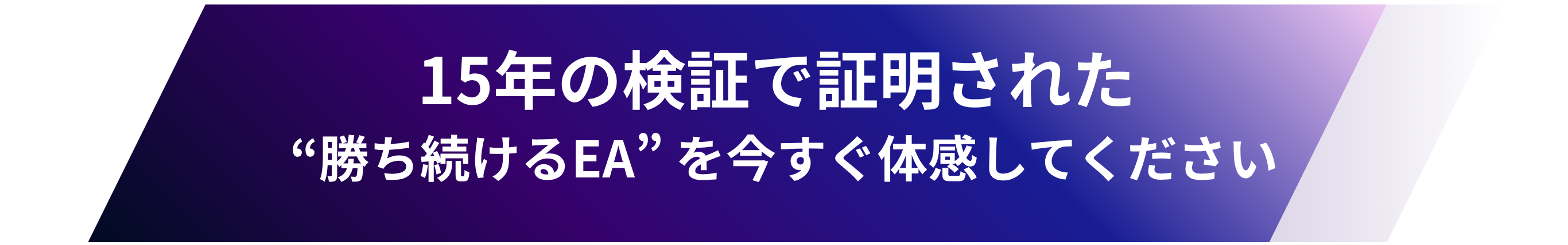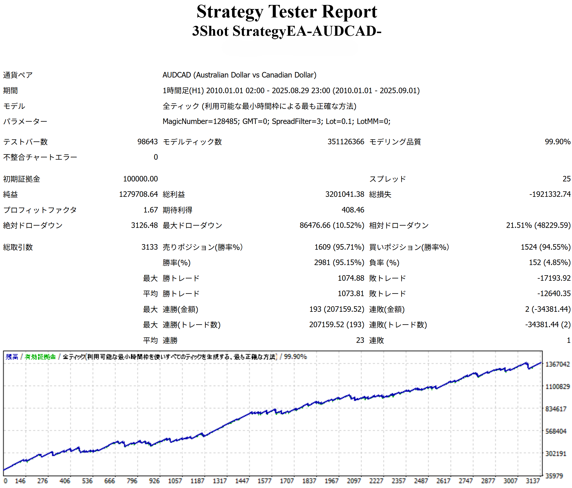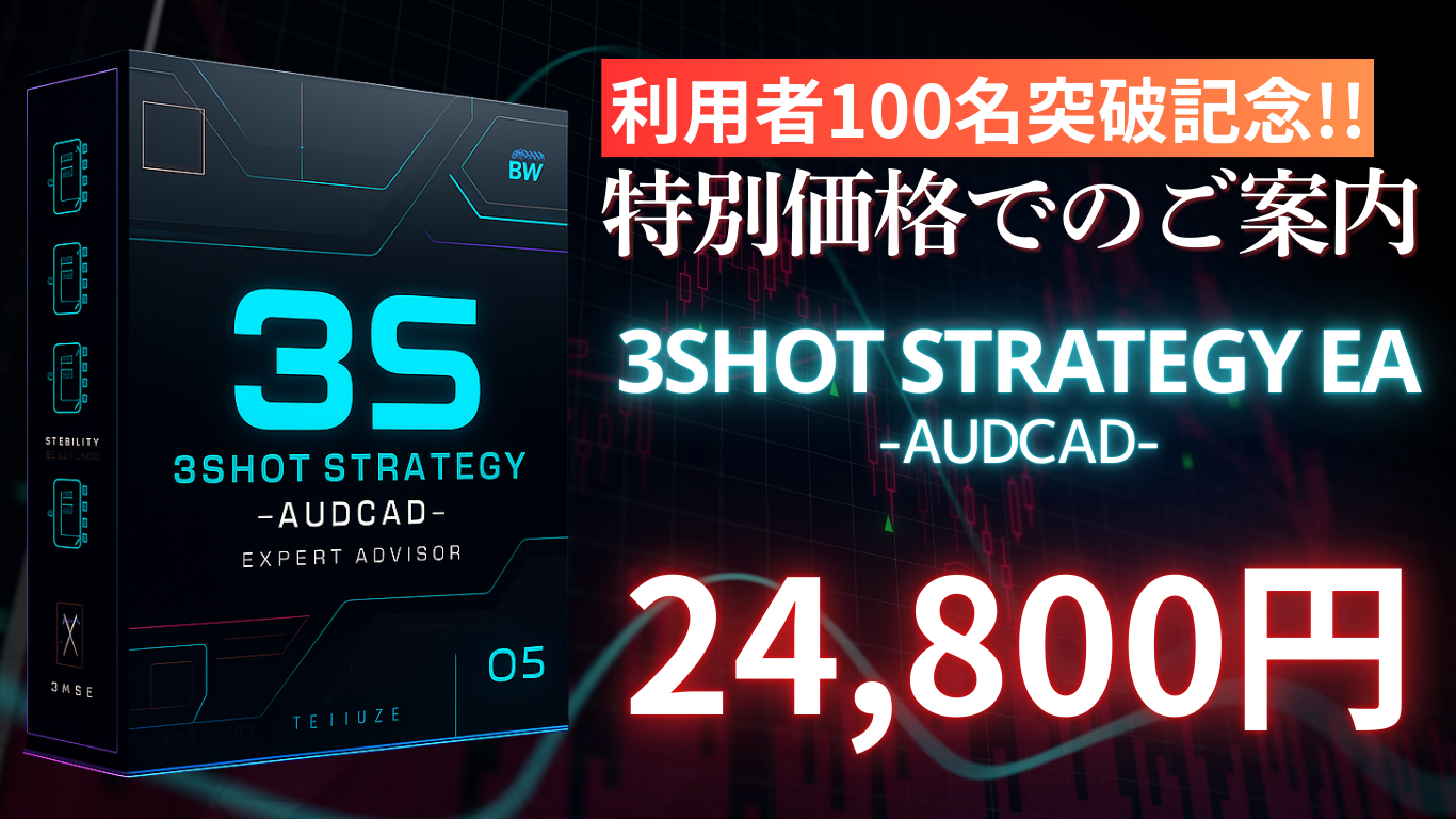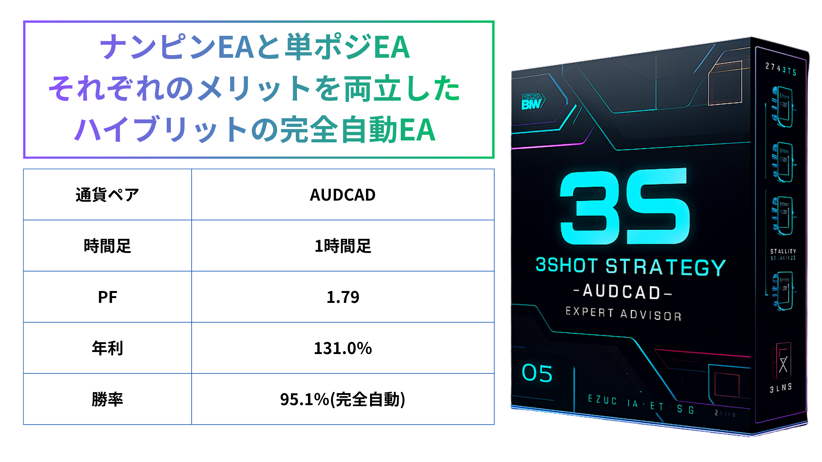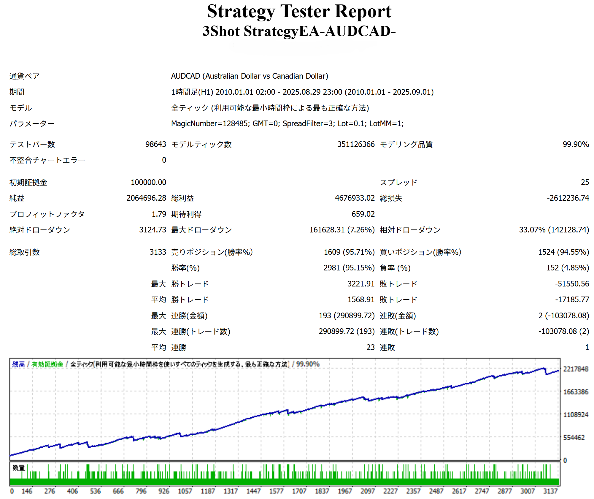 これまでEAを運用したことがあるトレーダーなら、 ・最初は勝てても、負けが続けば「このEAはダメだ」と感じてストップ。 ・一度は資金が増えても、その後の連敗で削られてしまう。 ・あるいはナンピンを繰り返した末に、資金を一瞬で飛ばしてしまった…。 こんな経験をしたことがあるかもしれません。 もちろんロジックや性能も原因のひとつですが、 本当の理由は「EAを継続できないこと」。 事実としてEAで稼ぎ続ける未来を手放しているのは 最終的には「自分自身の判断」なのです。 しかし、すべてを任せる完全自動のEAであれば 負けが続けば止めたくなるのも当然。 性能の悪いEAであれば早い決断はむしろ正解です。 そしてここまでの内容を踏まえ、 あなたにお聞きしたいことがあります。 「継続し続けたくなるEAに出会ったことはありますか?」 答えがNoであれば、 ぜひ「3Shot Strategy EA-AUDCAD-」の性能をご覧ください。 これまでのEAとは一線を画し 「止めたくなることがない」「継続できる」ことを前提に設計された、 全トレーダー待望のEAであることを実感いただけるはずです。