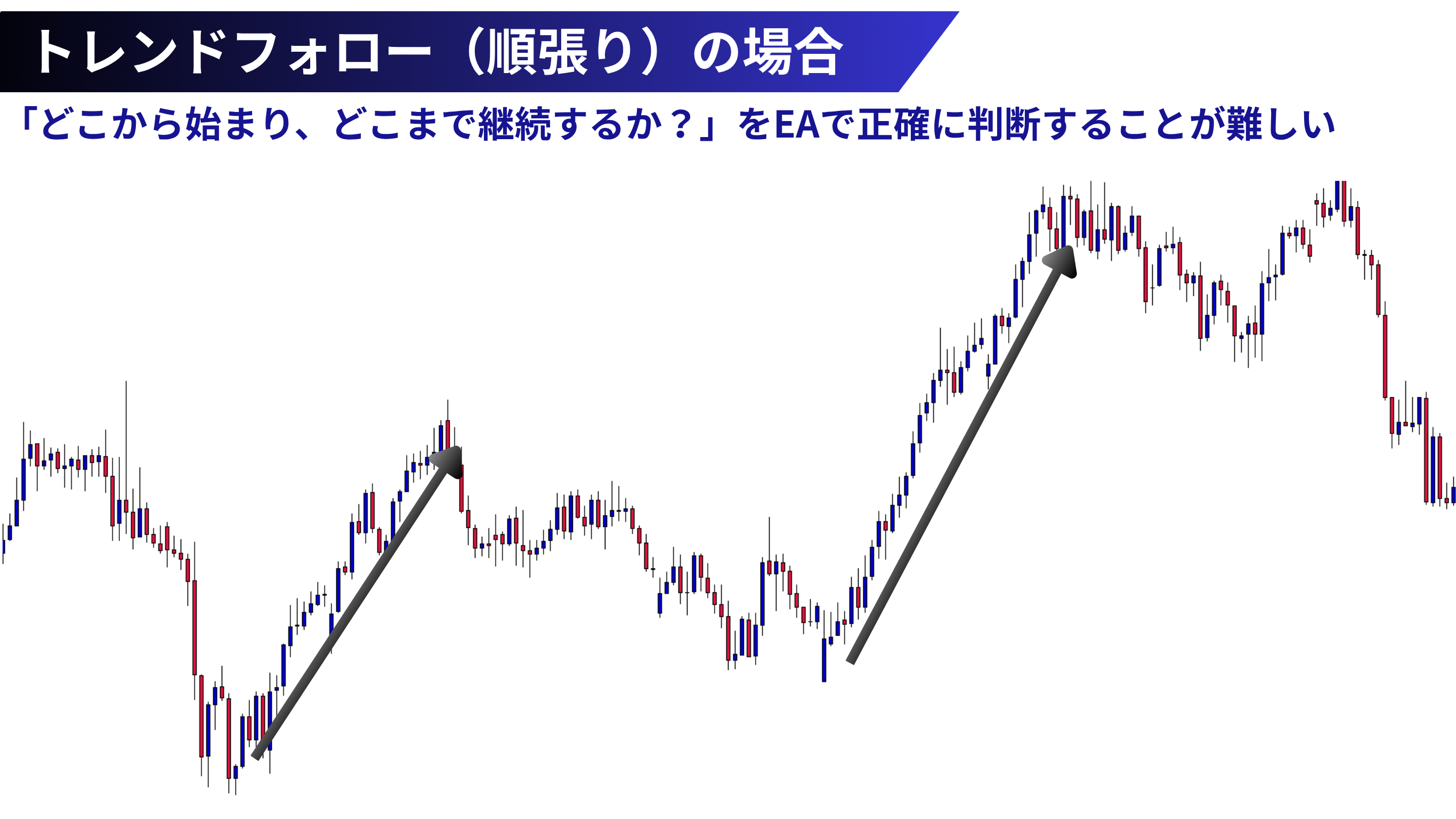 完全自動のEAで“勝ち続ける”ために重要なのは「勝ちやすい場面」だけを狙い撃ちし、深追いせずに利益を確定すること。その観点で見ると、EAにおけるトレンドフォロー型(順張り)の手法には大きな弱点があります。