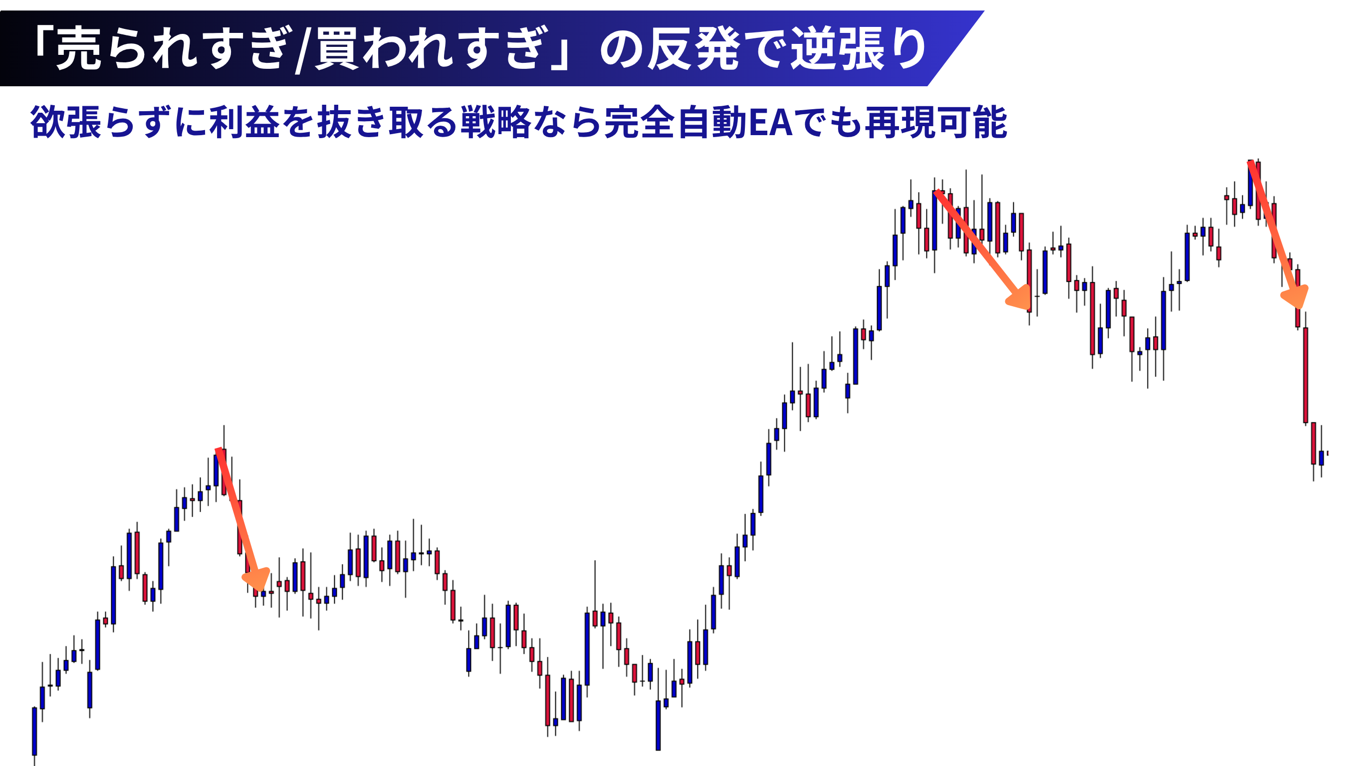 つまり逆張りの手法です。このシンプルで再現性の高い戦略こそが、完全自動で“勝ち続ける”ための最適解なのです。