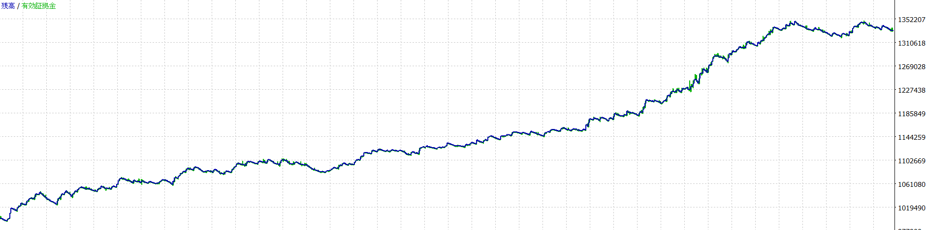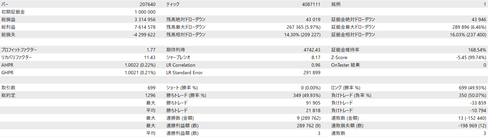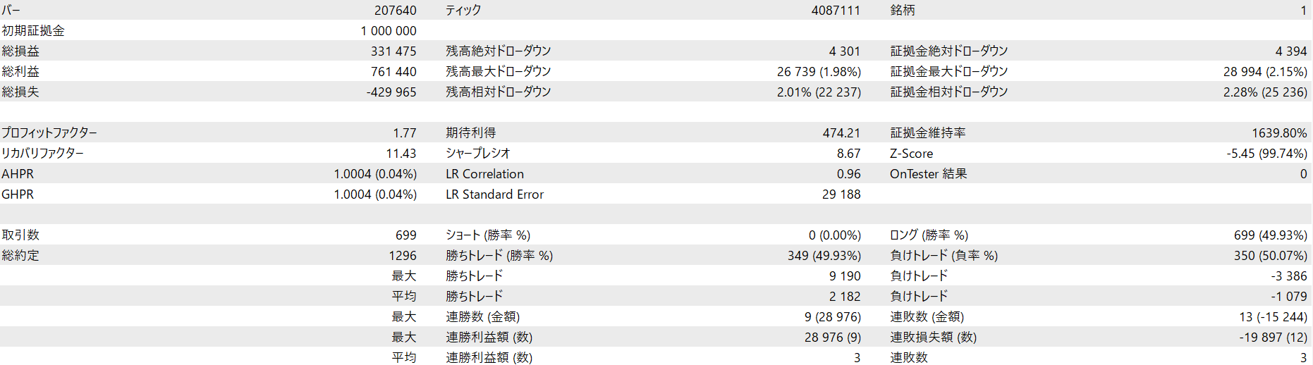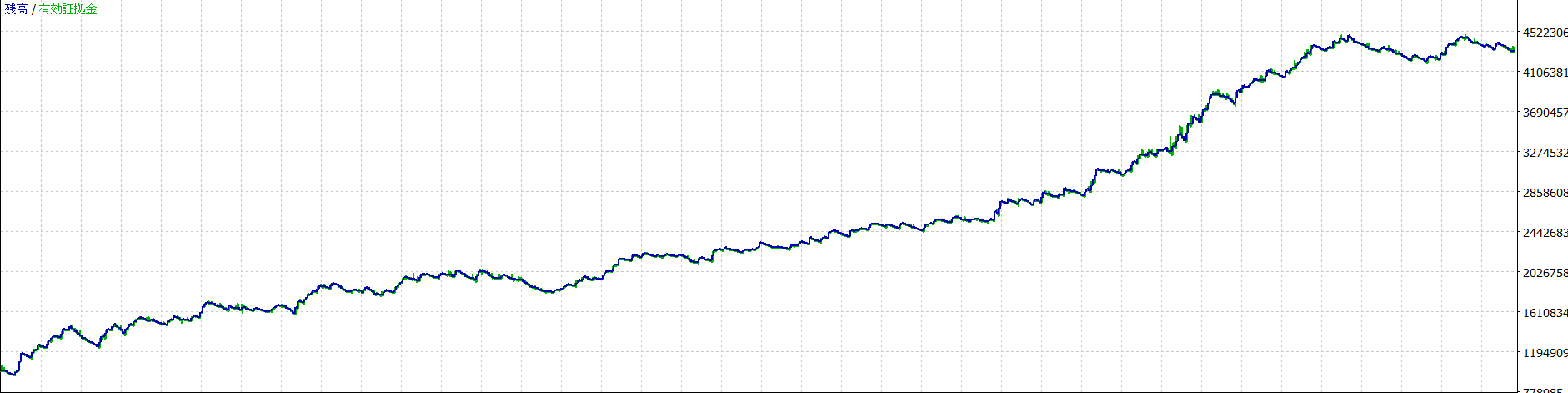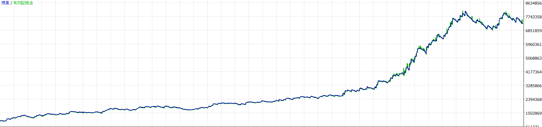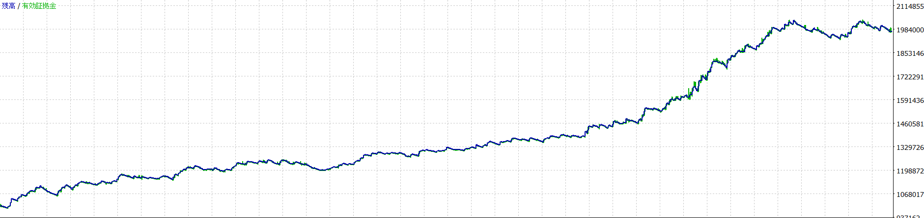 全て1,000,000JPYの証拠金、レバレッジ1:25にて計測しています。 ※レバレッジは計測結果に基本的には影響を与えませんが、極端に低いレバレッジだとポジションが取れない場合もあります。 kotei_lotがtrueの場合