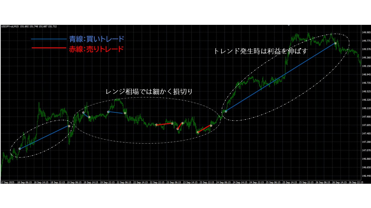 基本的な戦略としては、トレンド発生時に順張りでエントリーする王道のロジックです。