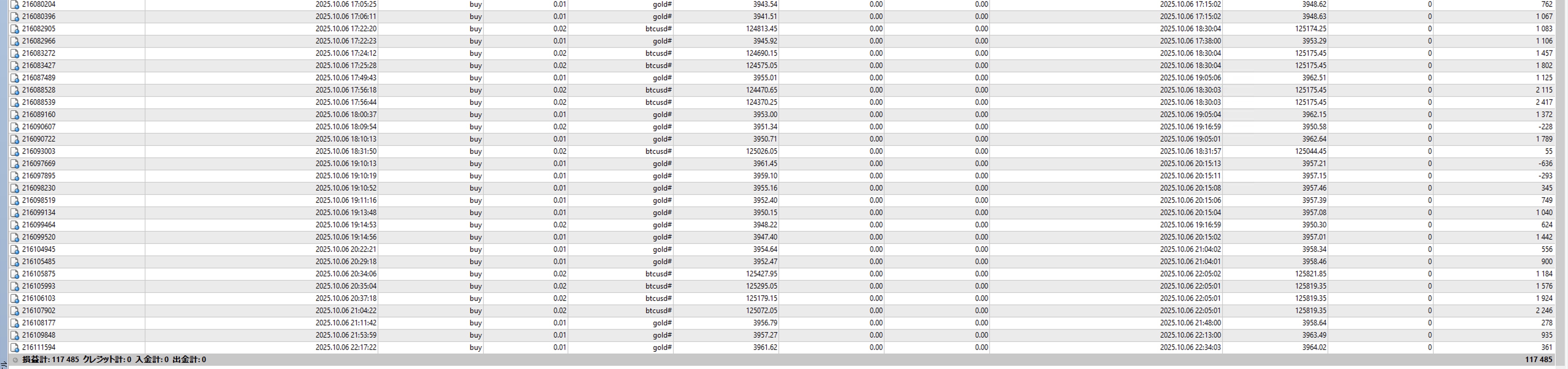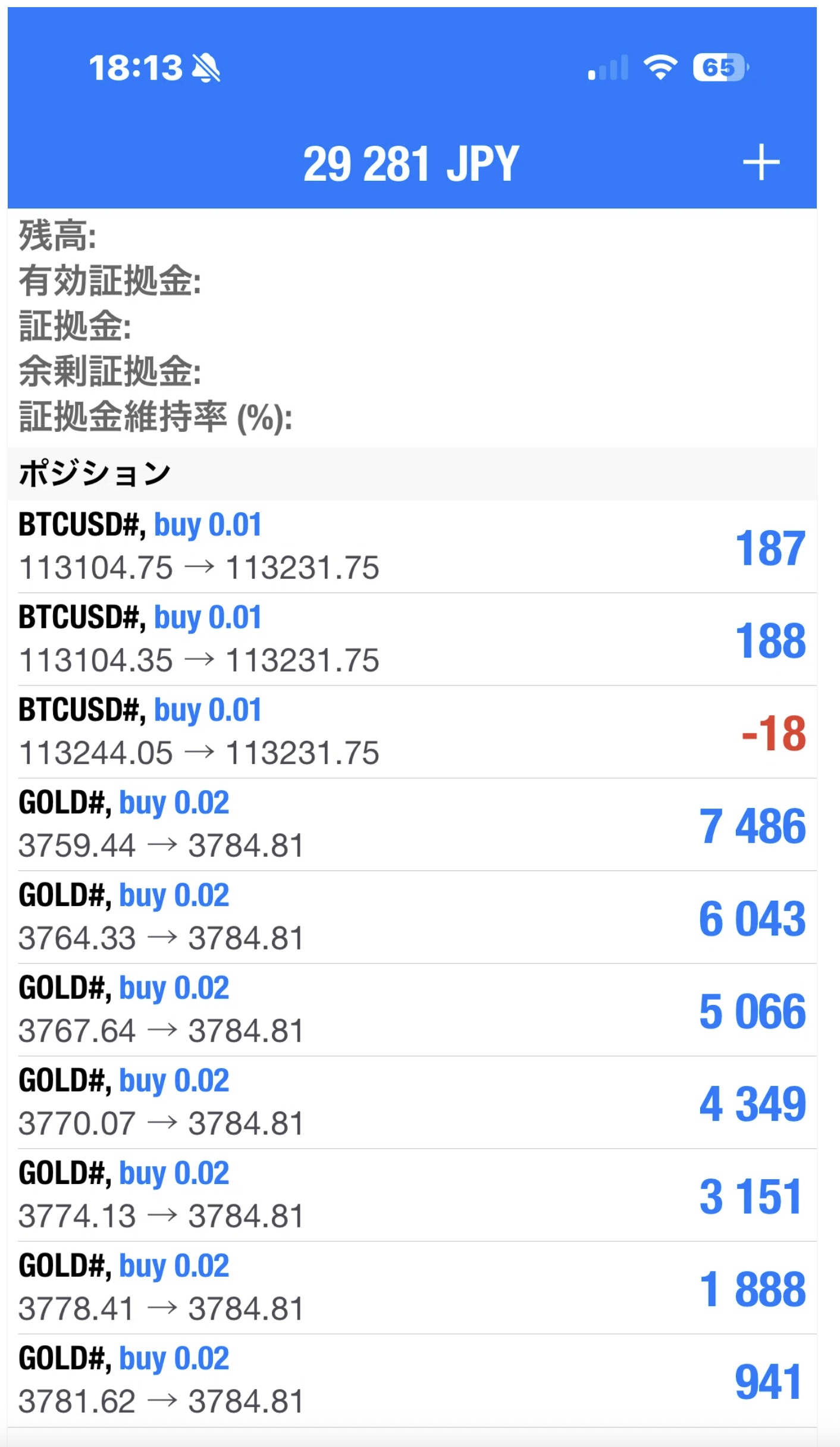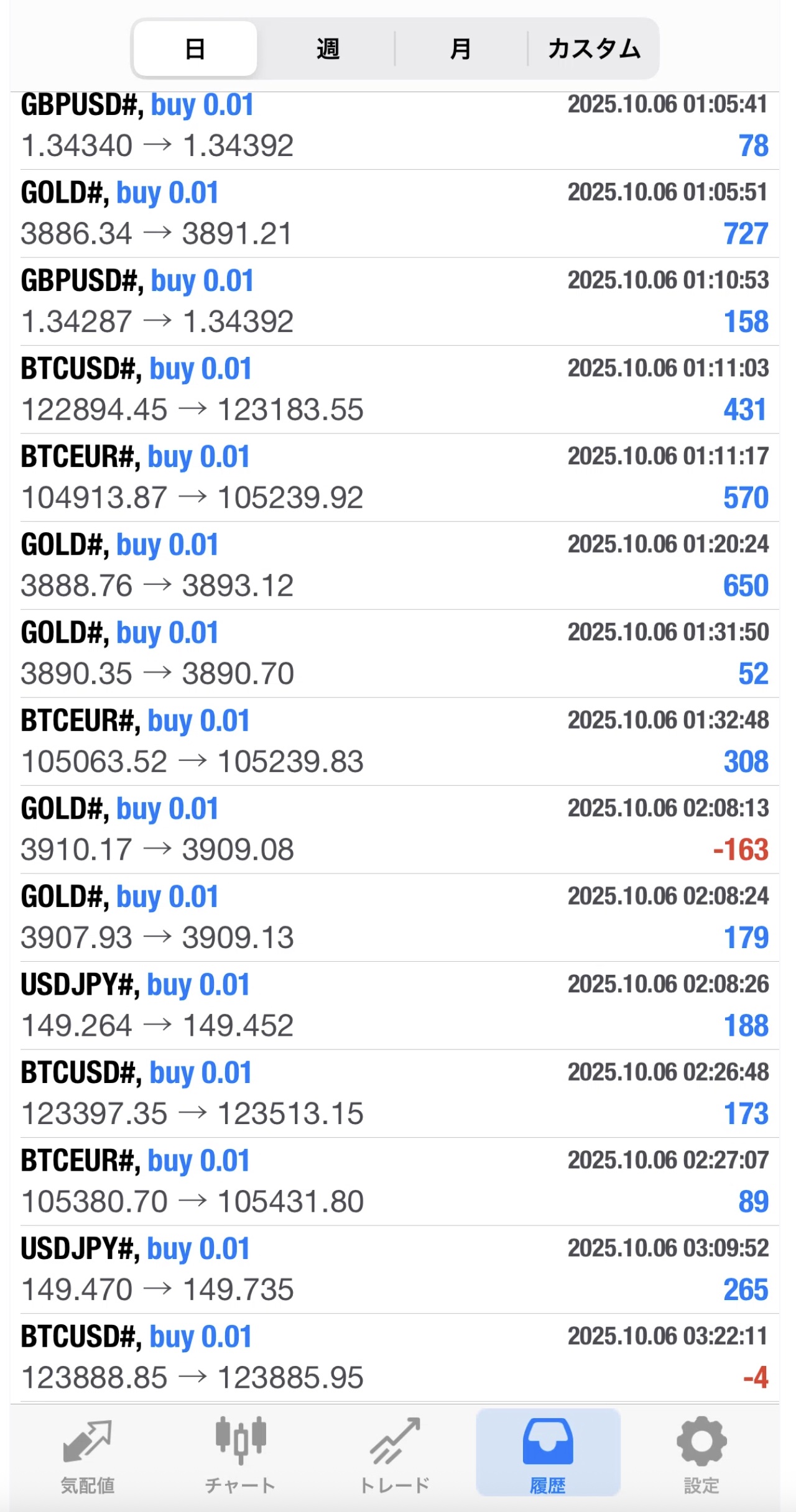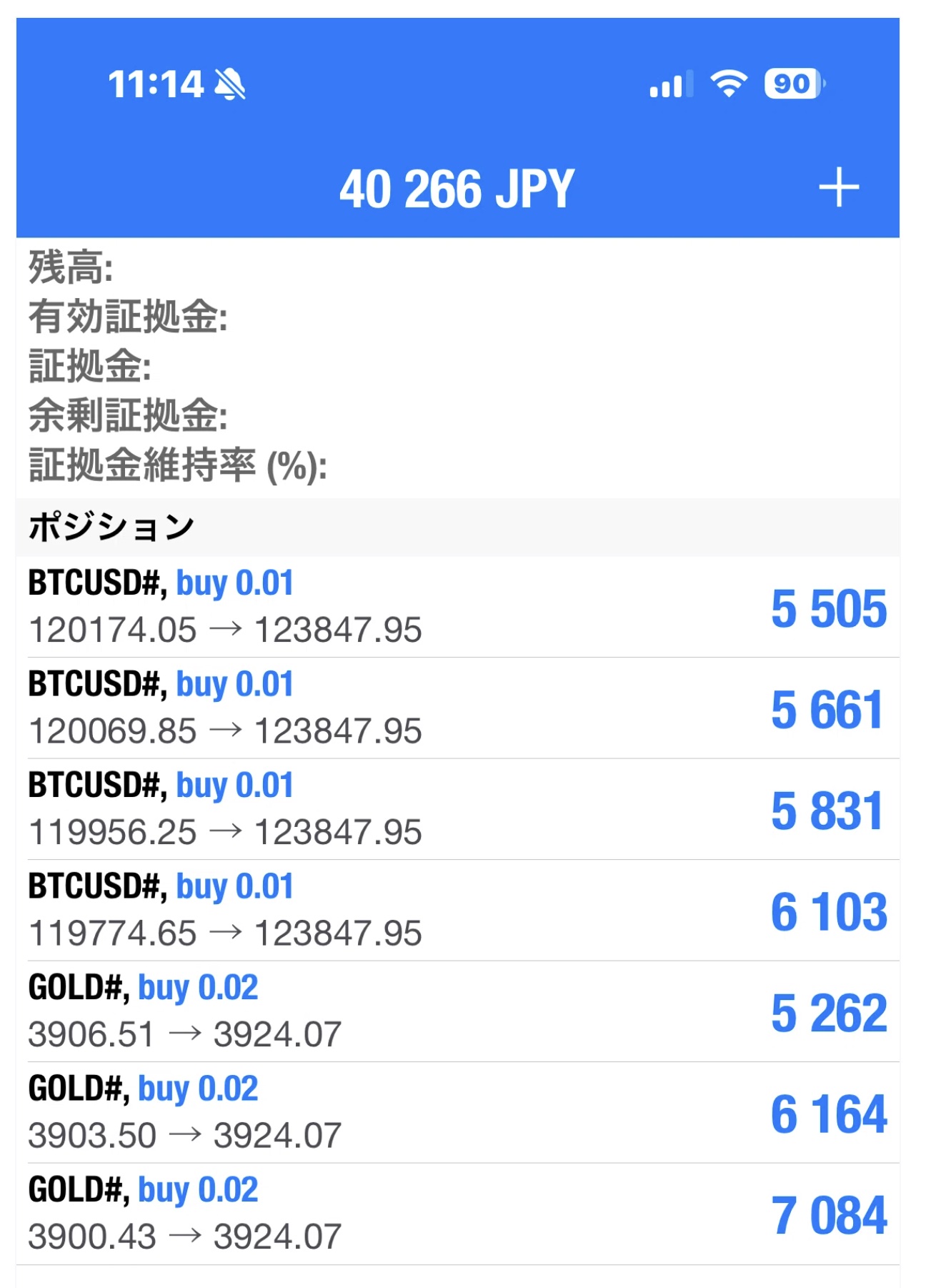 ゴールド1分足、5分足とビットコイン1分足、5分足を稼働させ、ロットは1分足が0.01ロット、5分足が0.02ロットです。