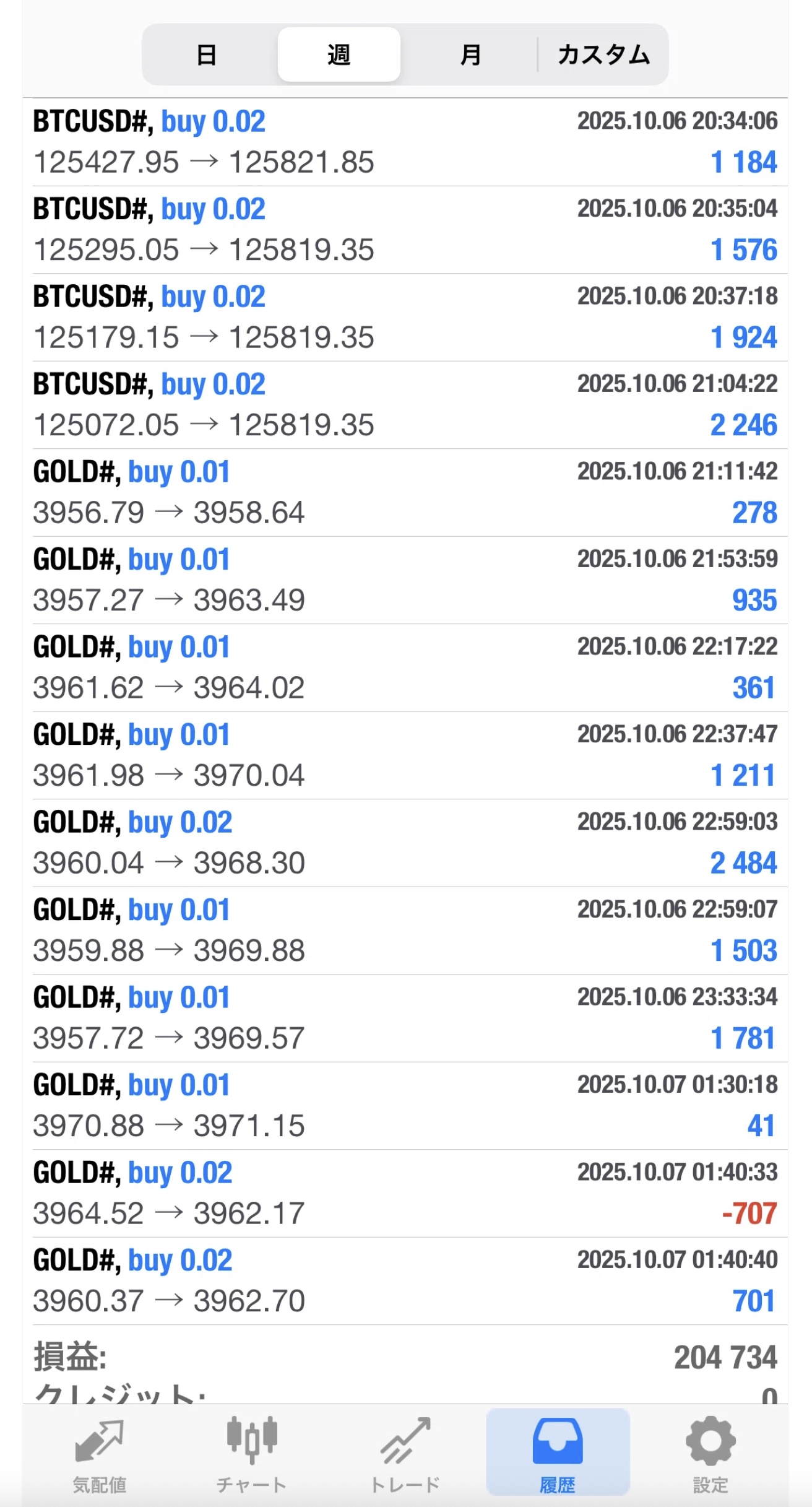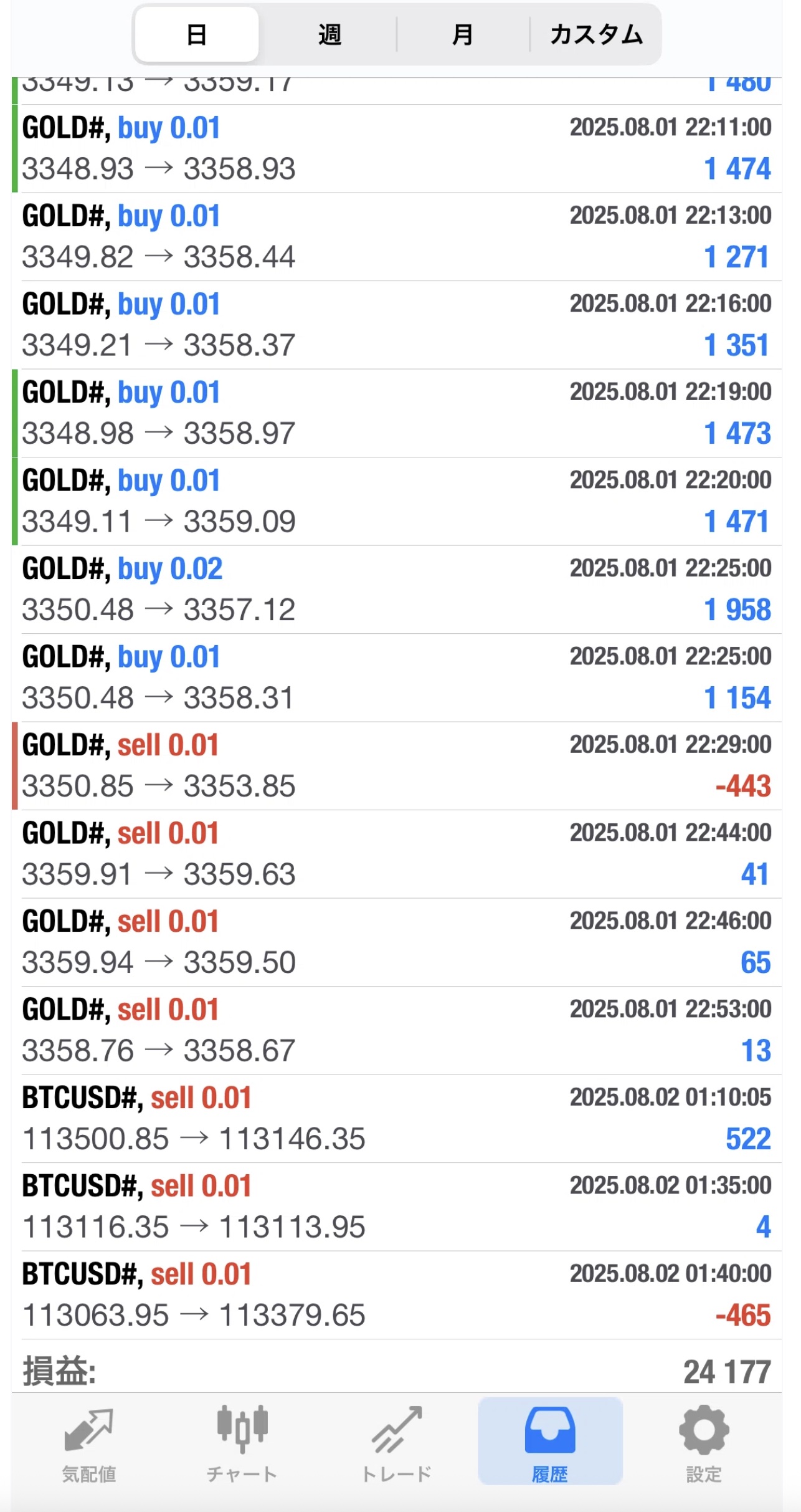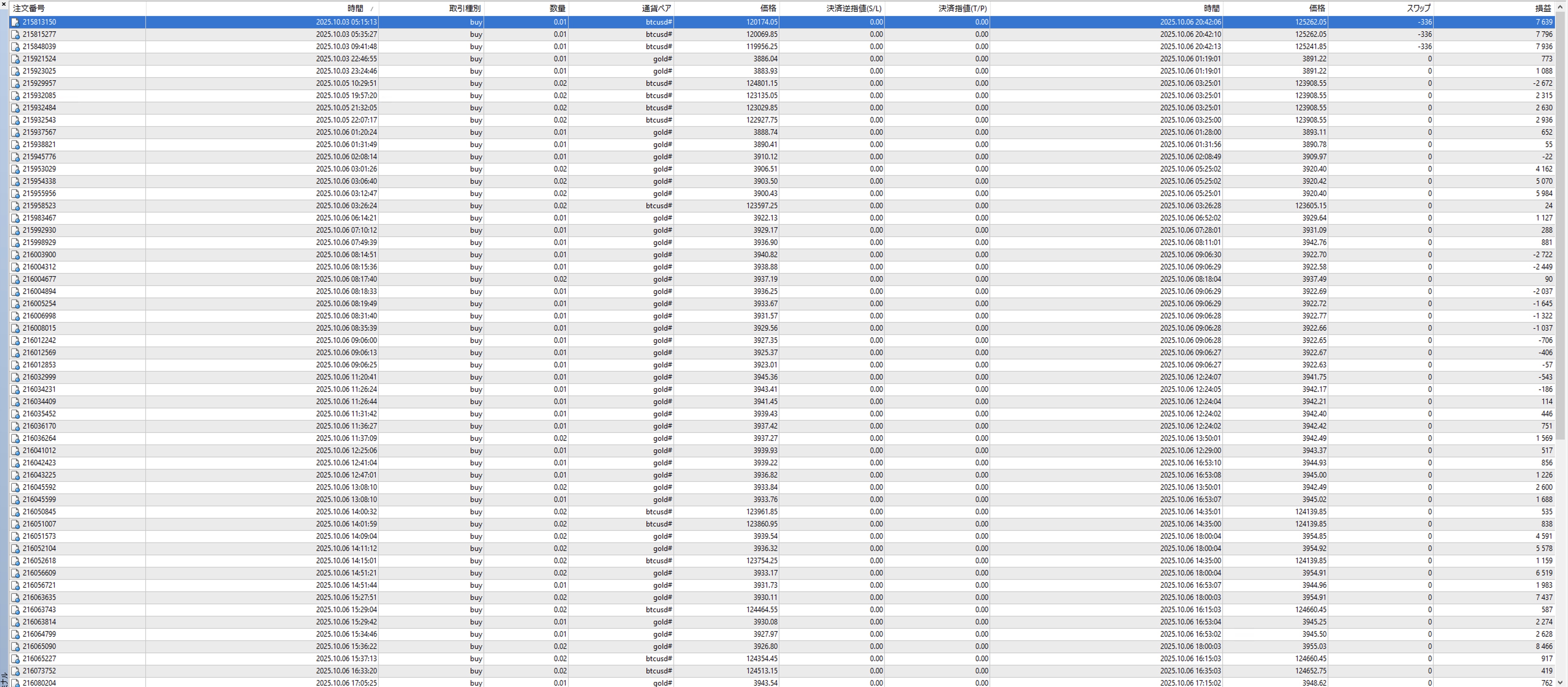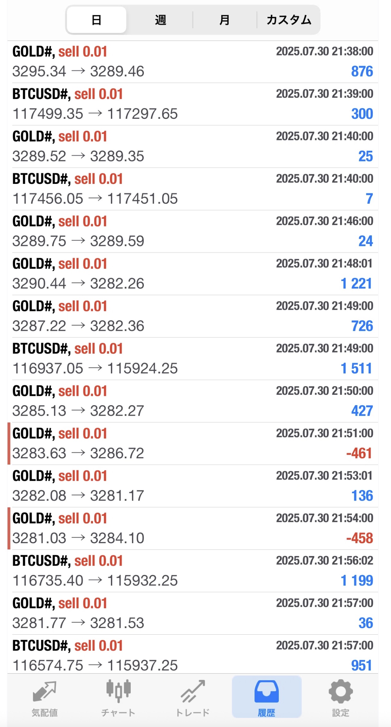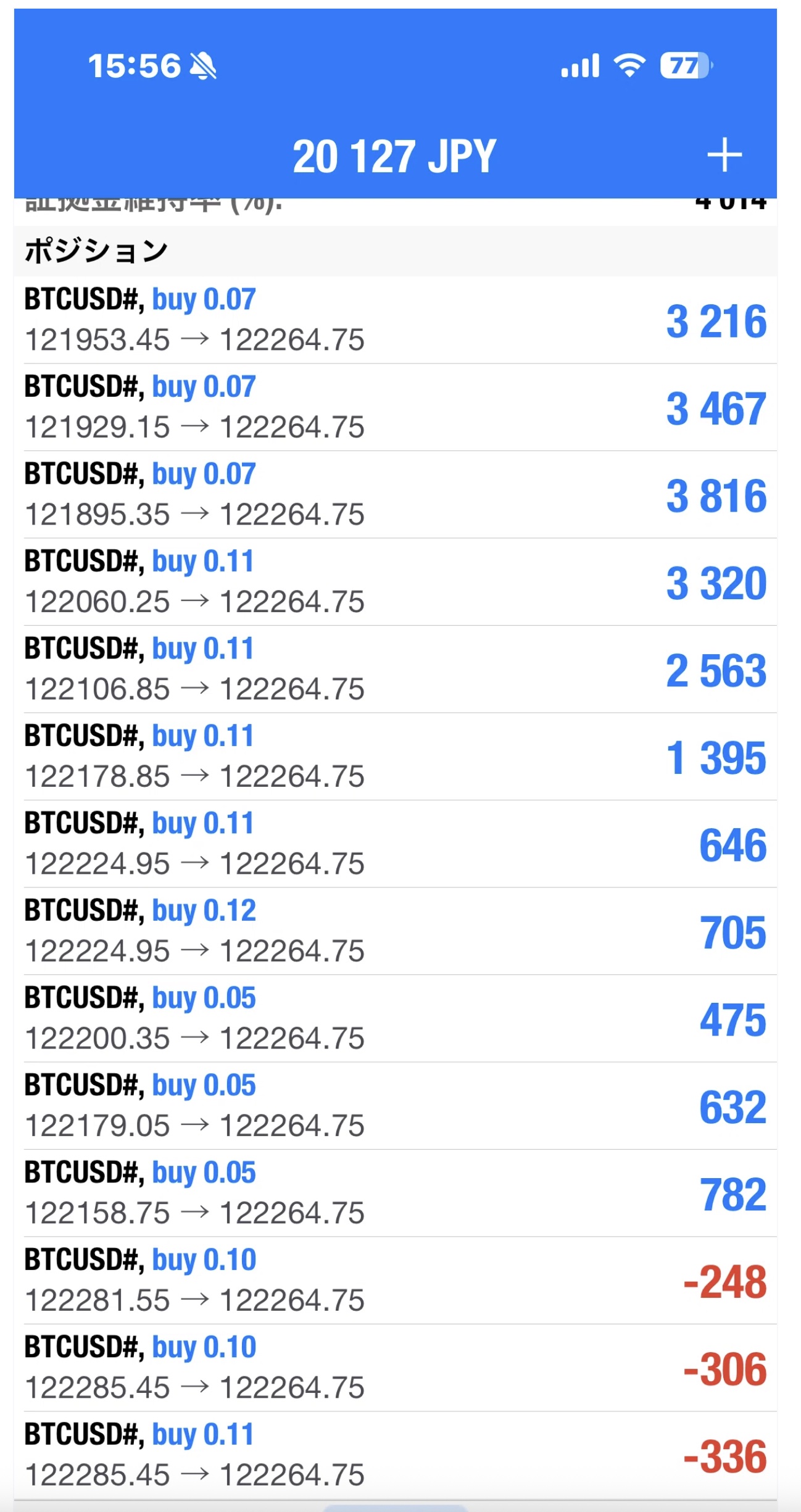 ゴールド1分足、5分足とビットコイン1分足、5分足を稼働させ、ロットは1分足が0.01ロット、5分足が0.02ロットです。