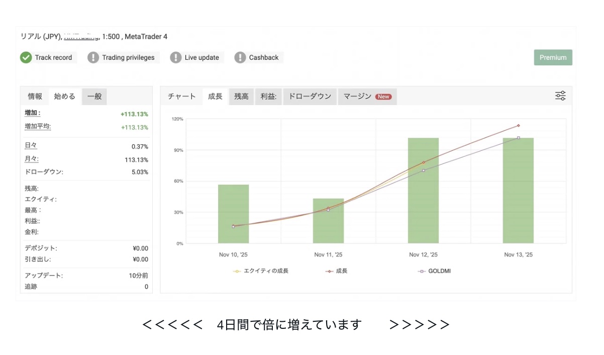 この期間ですが、止めた方が良い日が数日ありましたので実際にはドローダウンなども含め成績はもっと良くなります。