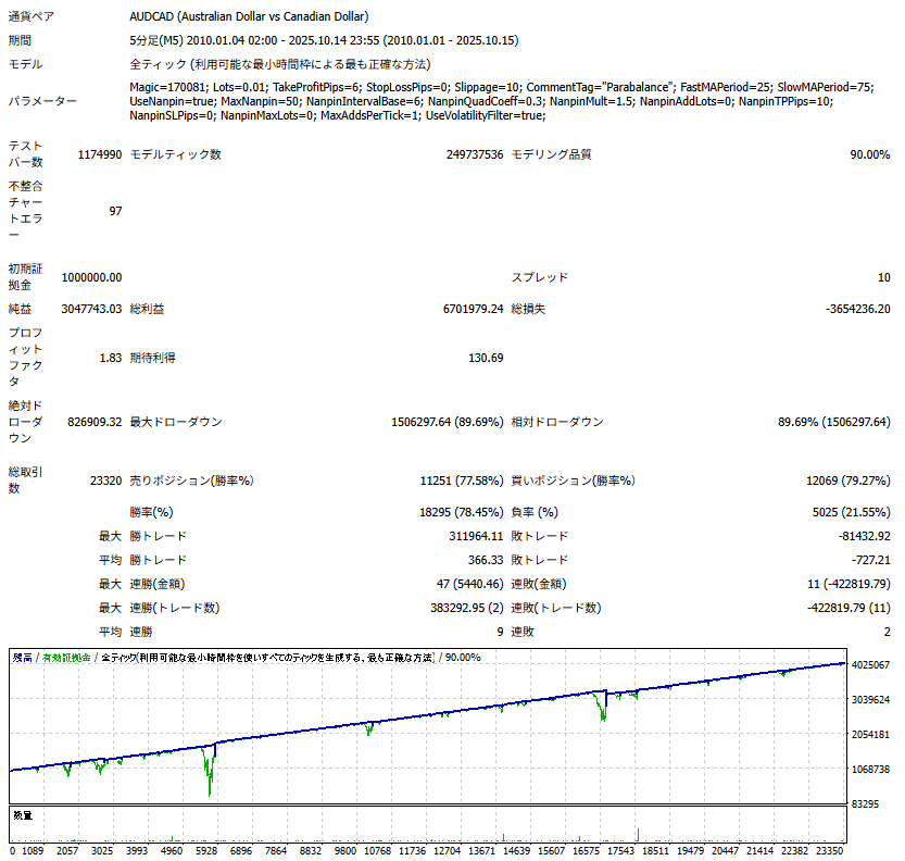 AUDCADの高い回帰性に特化したナンピンマーチン系EAです。 追撃(ナンピン)間隔を二次関数的に拡大する設計により、逆行時でもポジションが過密になりにくく、含み損の膨張を抑えながら安定運用を目指します。 さらにATRベースの高ボラ停止により、急変時は自動で追撃を休止して無理撃ちを回避します。 また、設定によって証拠金維持率によって追撃を休止する機能もあります。※デフォルトは無効 2010年から2025年の15年間のバックテストでも一貫した挙動と安定性を確認しています。
