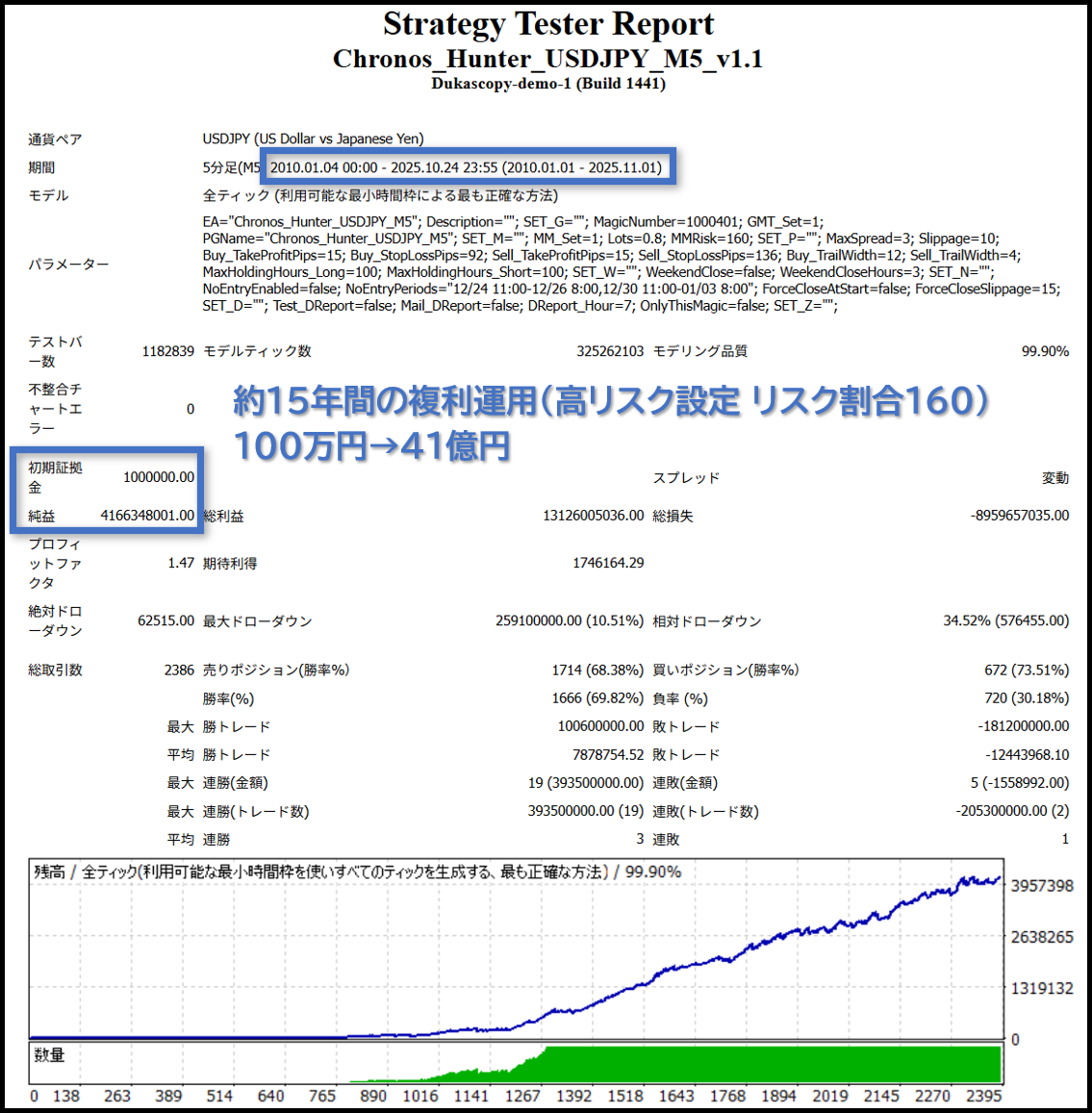 15年10ヶ月のバックテストで、高リスク設定(一例としてリスク割合設定:160)の複利運用の場合