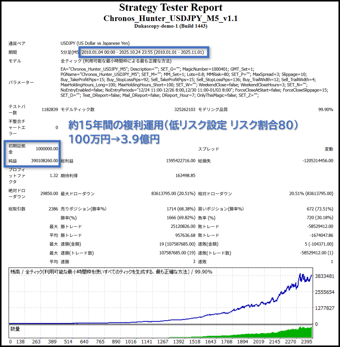 なお、本EAは固定ロット運用でも十分有効に活用可能ですが、複利運用でその真価を発揮します。