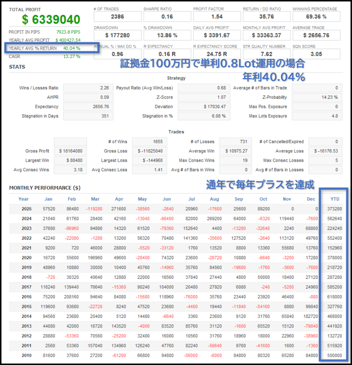 通年で毎年プラス記録を達成しており、長期統計的に安定運用を証明。