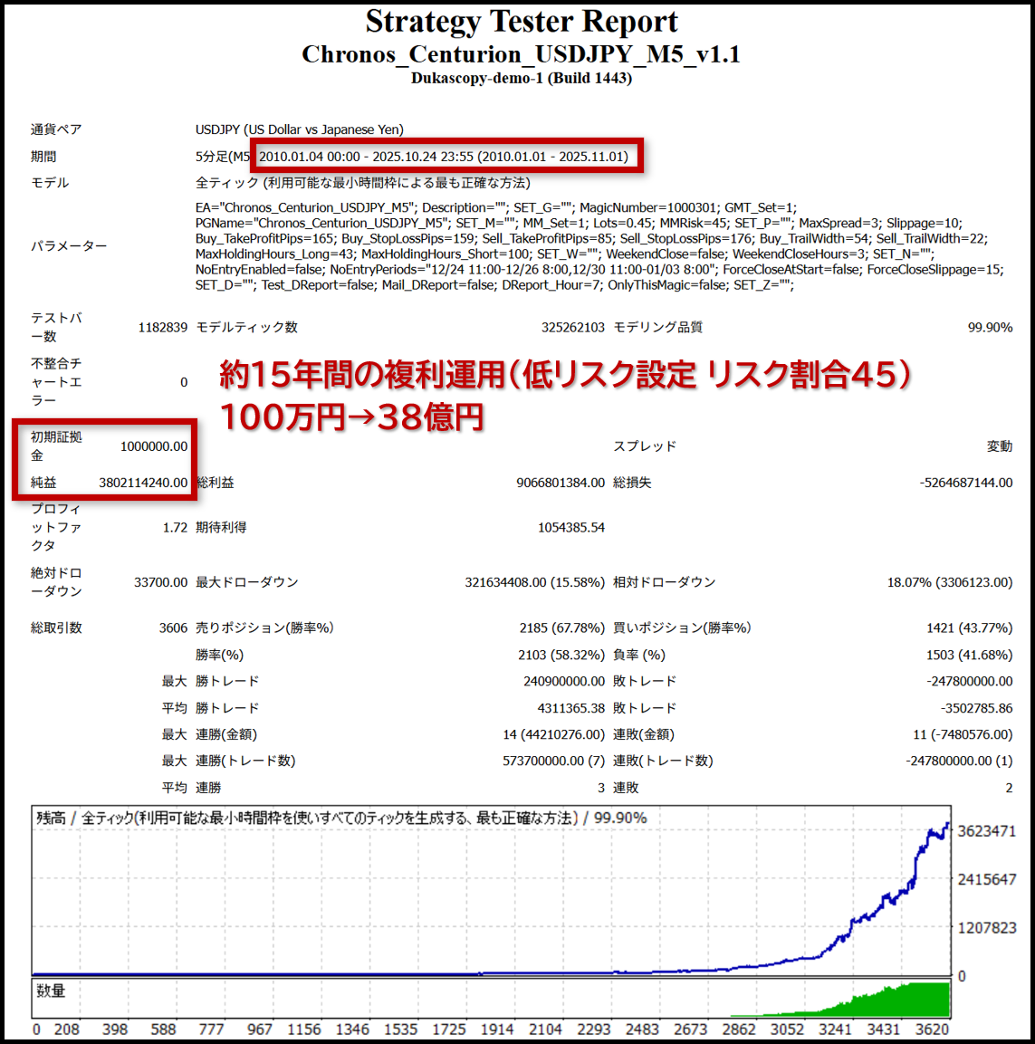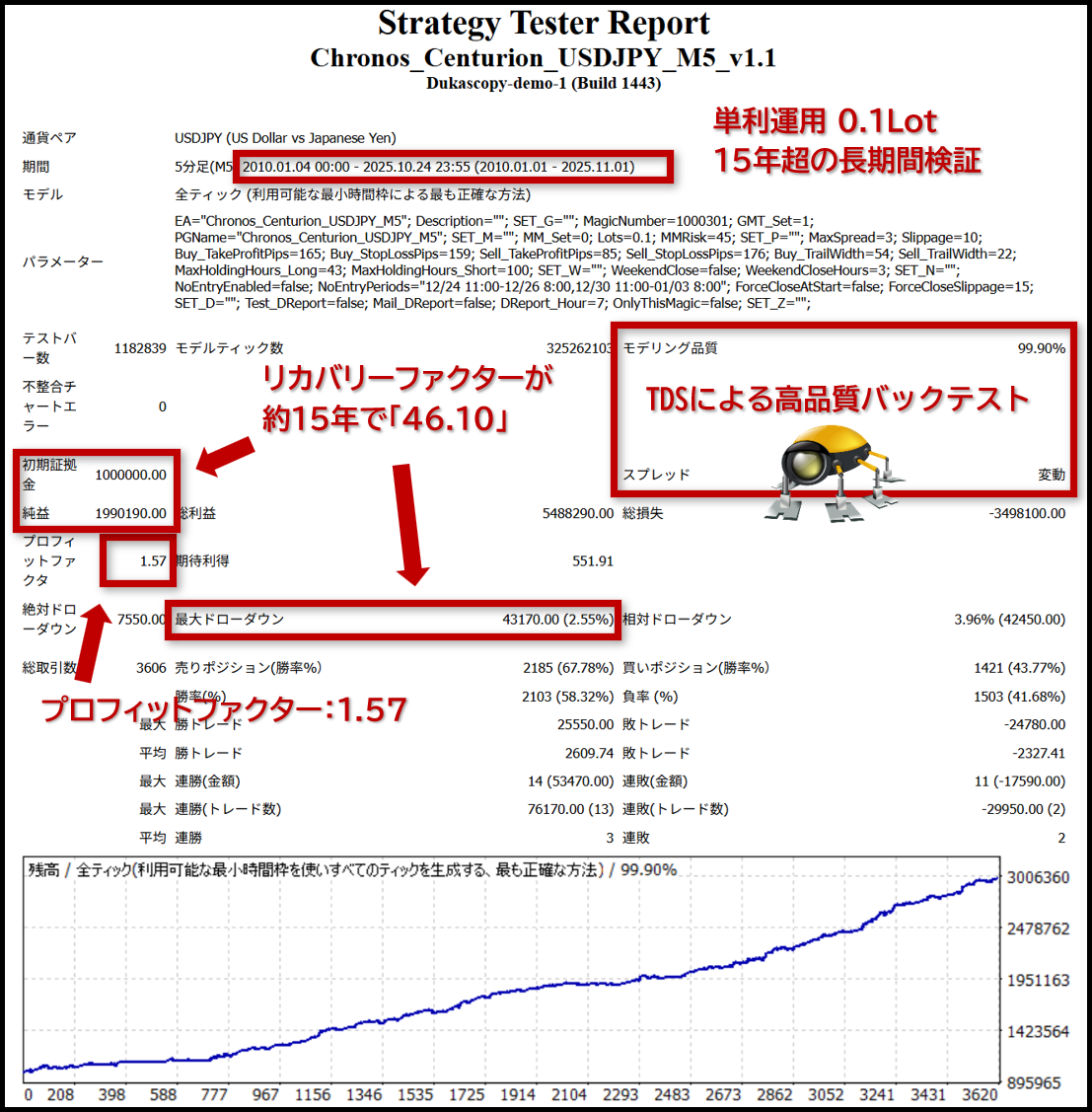 安定のUSDJPYの5分足に特化した最適化を施したEAで、本EAは2010年から2025年までの約15年10ヶ月間のバックテストで、驚異のリカバリーファクター「46.10」を達成しています。