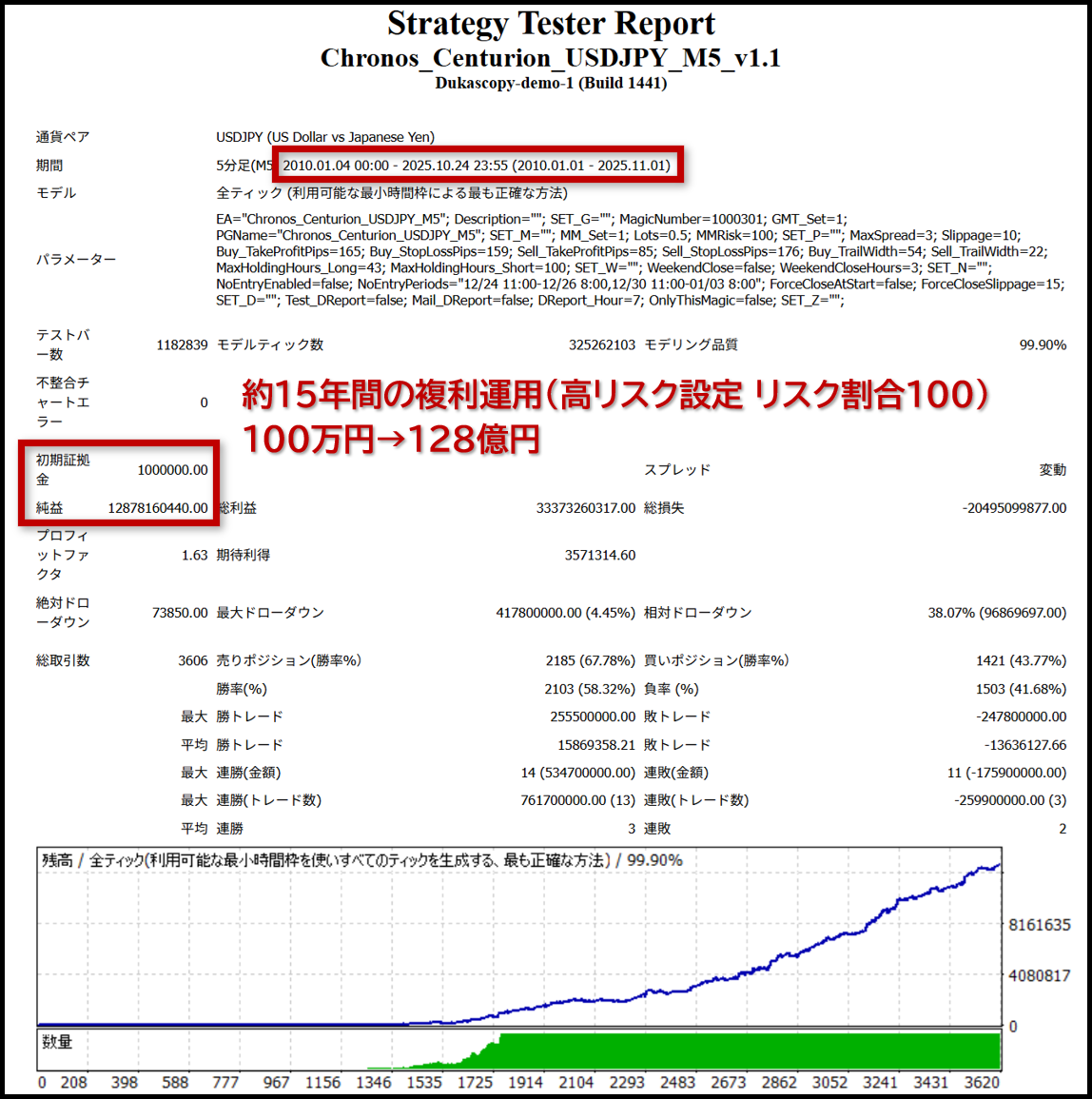 15年10ヶ月のバックテストで、高リスク設定(一例としてリスク割合設定:100)の複利運用の場合