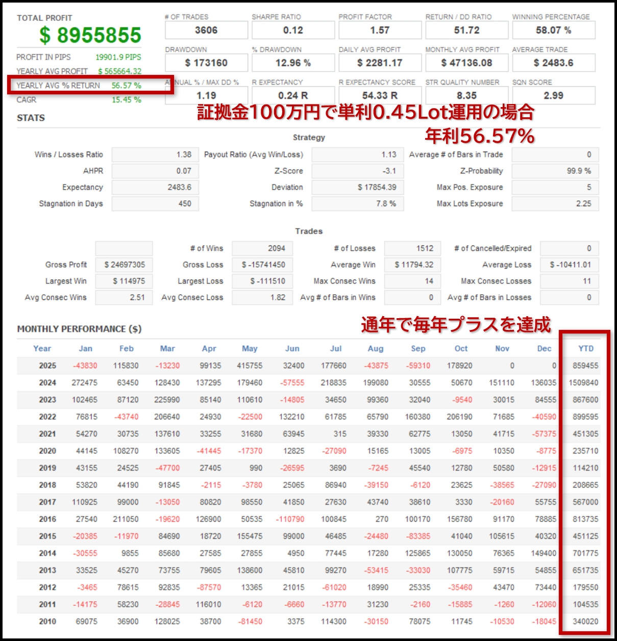 上記1つ目のQを参考にして、レバレッジ25倍口座で初期証拠金100万円、0.5ロット単利[固定]の15年10ヶ月間の運用結果は純益が約896万円でした。割ると1年で約57万円。初期証拠金100万円で57万円の利益と考えると年利約57%という計算結果となります。なおロット設定・単利複利設定によっても結果が異なる点はご了承ください。