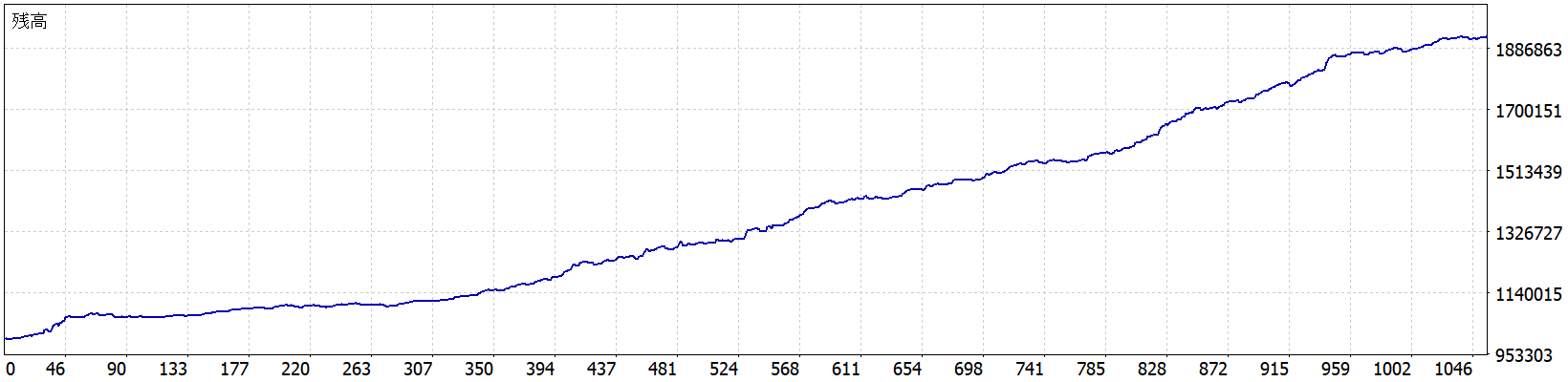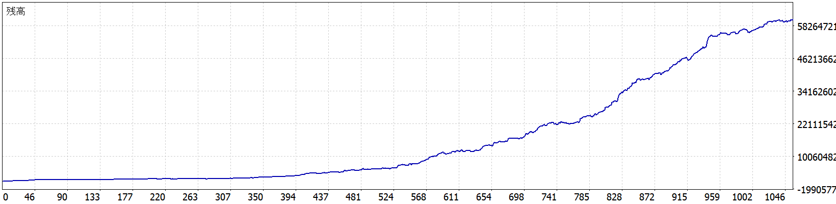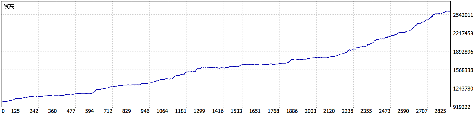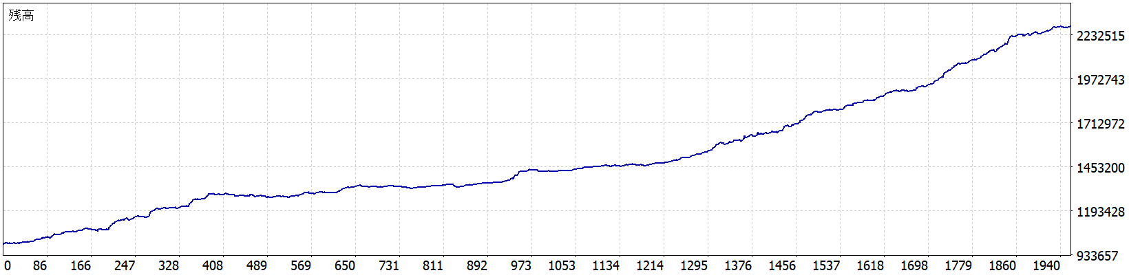 USDJPY単体運用のため、比較的少額からでも開始可能です。ロット数にもよりますが最低5万円~、推奨10万円程度あれば、ドローダウンに耐えつつ余裕を持った運用が可能です。
