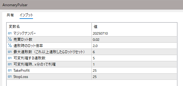 AnomaruPulserは、この統計的優位性を活かしてエントリーし、安全性を重視した“最大回数指定型マーチンゲール” を組み合わせた戦略EAです。