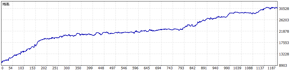 | 総取引数 | 1197 | 売りポジション(勝率%) | 580 (54.31%) | 買いポジション(勝率%) | 617 (50.08%) |