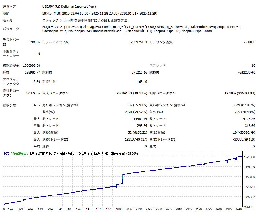 このEAの、バックテスト結果は下記をご確認ください。