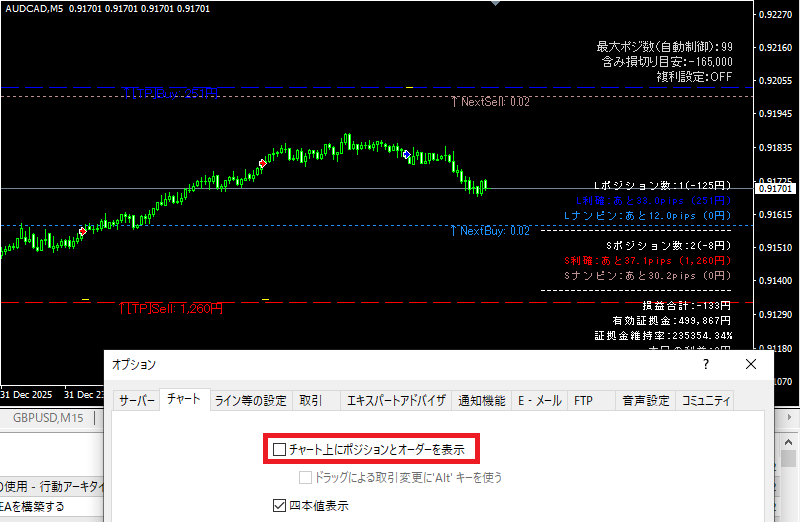 そのため、MT4の「チャート上にポジションとオーダーを表示」をOFFにすると
