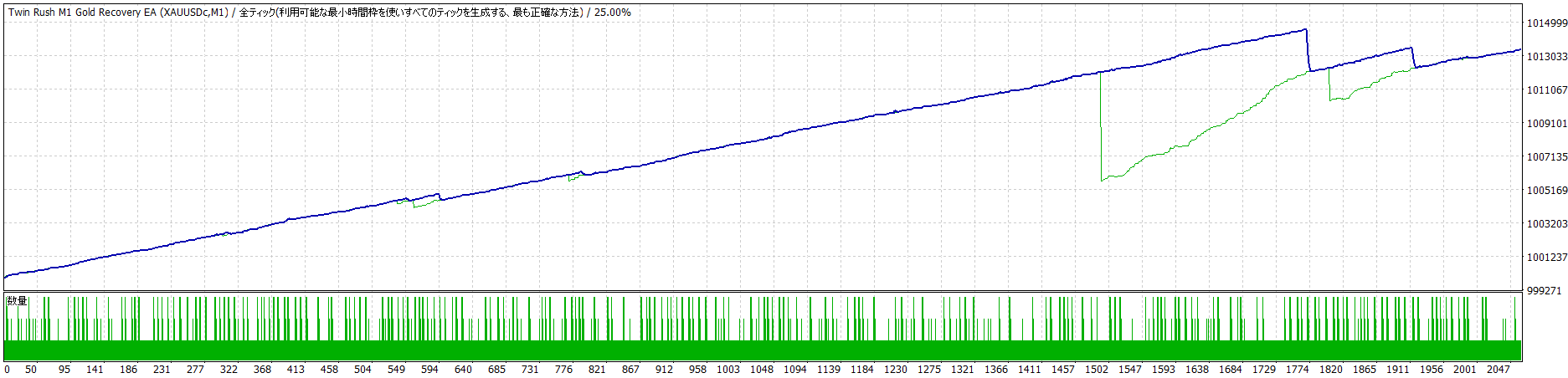 このバックテストの緑の線が下がったところが2025年10月の約400円の下落場面ですが、コツコツとG2ロジックによる回復力により、見事、含み損を回収しています!そしてM1により積極的にポジションをとるので、日々、利益の積み上げてくれます。