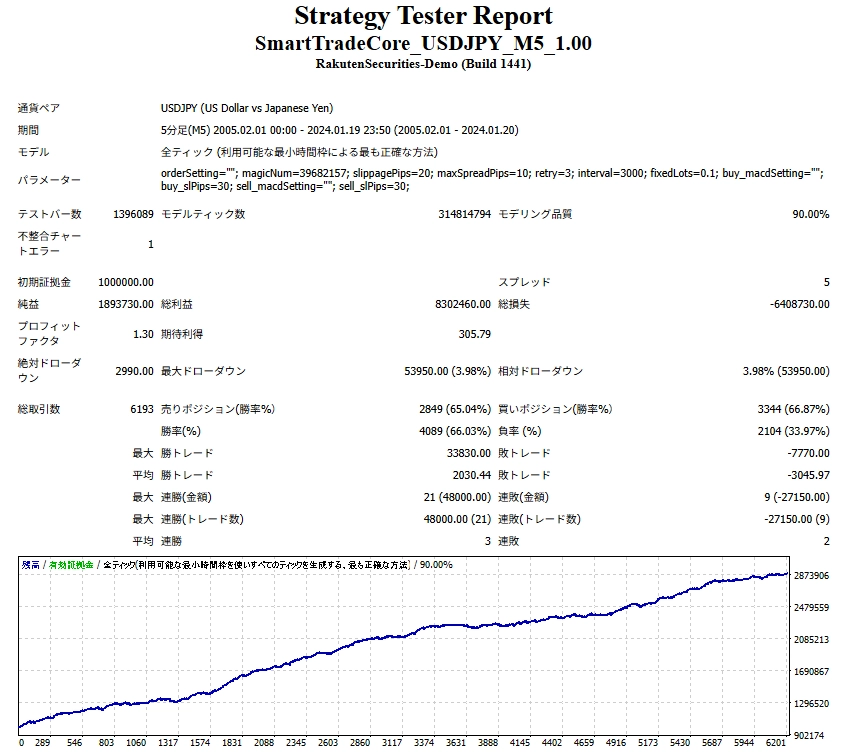 ・通貨ペア:USDJPY ・時間足:5分足(M5) ・バックテスト期間:2005年2月 ~ 2024年1月(約19年) ・初期証拠金:1,000,000 ・総取引数:6,193回 ・プロフィットファクター:1.30 ・勝率:約66% ・最大ドローダウン:3.98% ・モデリング品質:90.00% ※過去のバックテスト結果であり、将来の利益を保証するものではありません。