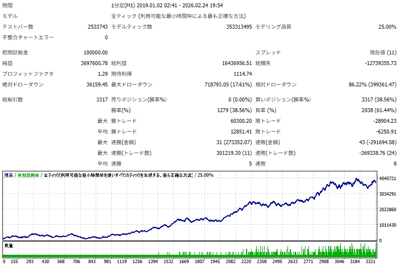 Increasing the lot size forcibly due to a high winning rate can, in rare instances, depending on the EA, lead to substantial Pips loss when a loss occurs. It is crucial to verify the SL Pips and the number of positions held before operating with an appropriate lot.