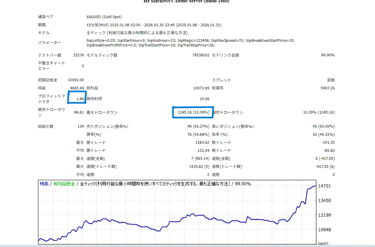 モデリング品質99.9%のテスト環境で検証を行い、プロフィットファクター1.6以上、最大ドローダウン約10%前後の結果を確認しています。