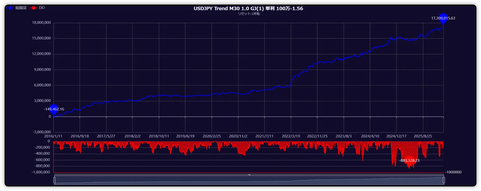 バックテスト期間:2016年〜2026年 ・総取引回数:1672回 ・プロフィットファクター:1.49 ・リカバリーファクター:17.5 ・勝率:47.2% ・最大ドローダウン:約98万円(初期証拠金100万円) ・総利益:約1700万円(初期証拠金100万円) ※0.01ロット運用時の最大ドローダウンは約6,300円程度 ■このEAの特徴 ・USDJPY専用ロジック ・トレンドフォロー ・ナンピンなし ・マーチンなし ・両建てなし ・最大ポジション1 無駄なエントリーを減らし、 利大損小を狙ったシンプルな設計です。 ■こんな方におすすめ ・ナンピンEAに不安がある方 ・低リスクで運用したい方 ・放置でコツコツ運用したい方 ■フォワード実績(リアル口座)