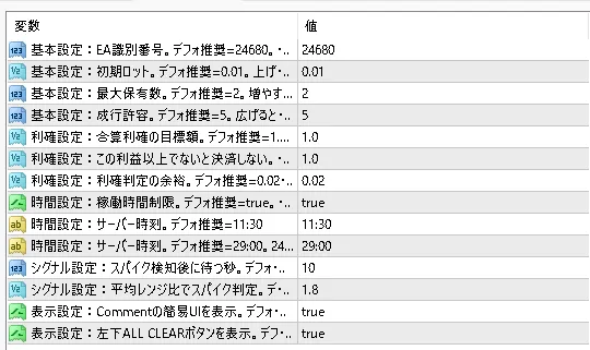 「ロット」「最大ポジション数」「利確金額」「時間設定」「スパイク関連」など、
