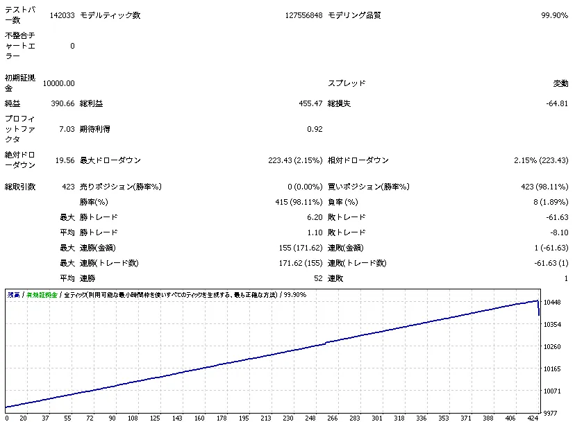 右肩上がりのグラフになっており、短期決着型EAとしてかなり素直な推移を見せています。