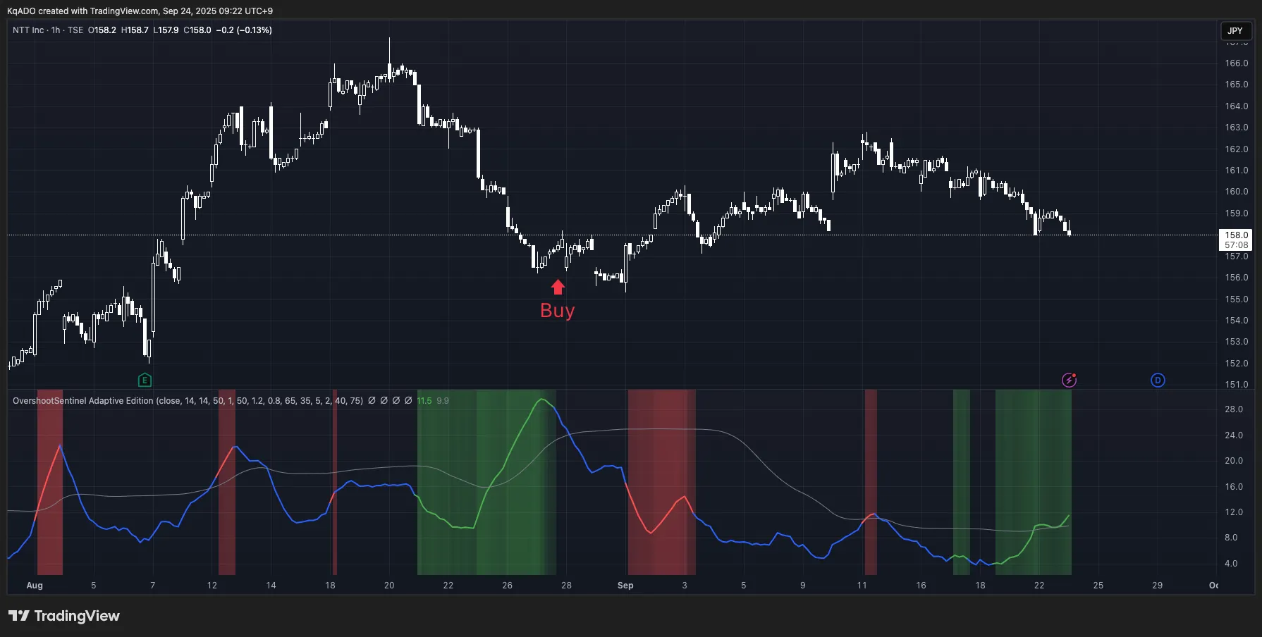 สัญญาณ overshoot จากเส้นสีเขียวที่แสดงการลดลงอย่างรุนแรงยังคงยืนยาวอยู่ จนเส้นเขียวกลายเป็นสีน้ำเงินจึงเป็นจังหวะซื้อแบบพักฐาน