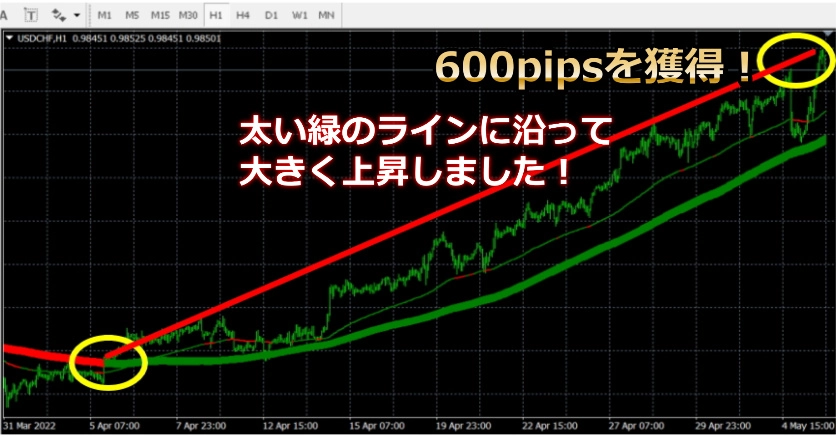ตามเส้นเขียวหนาอย่างมากและสูงขึ้นอย่างมาก และได้600pipsมาได้